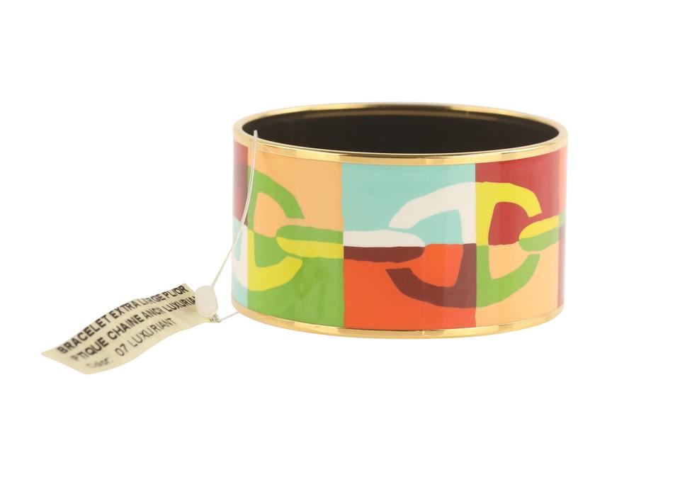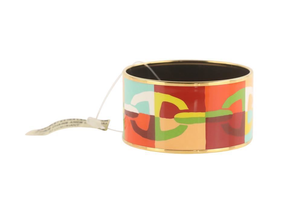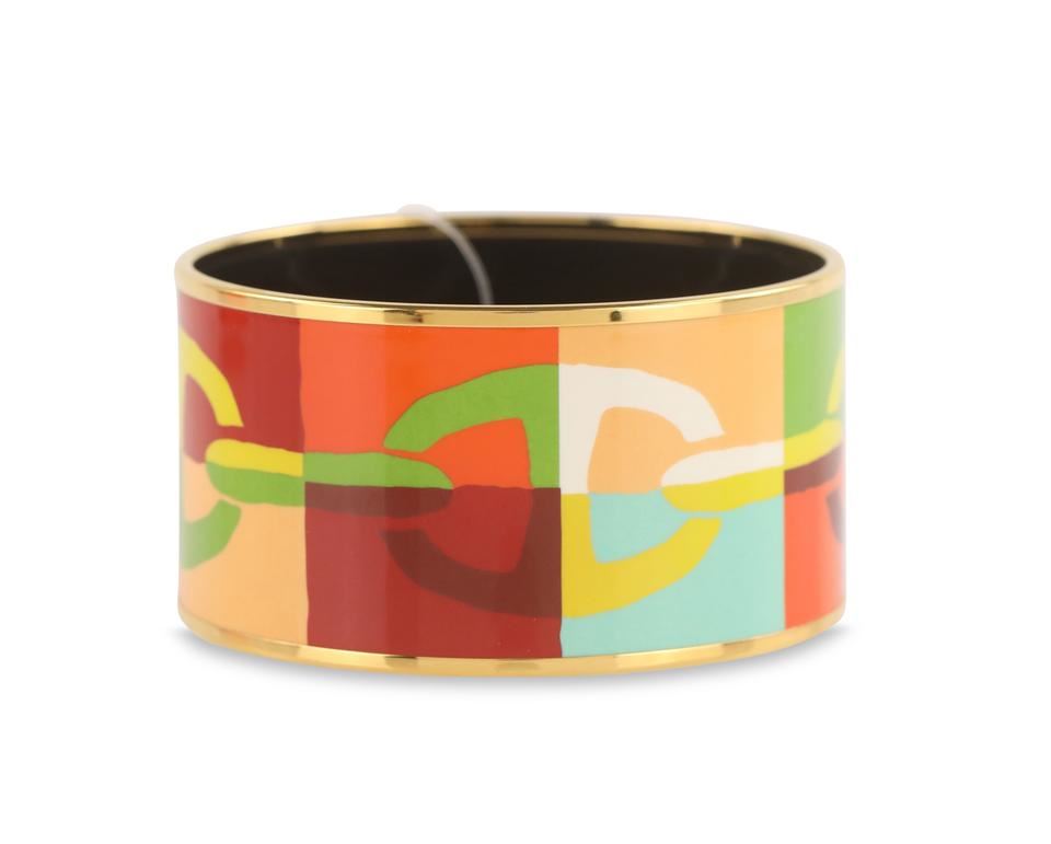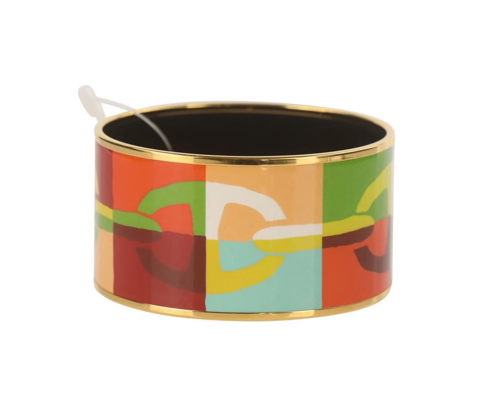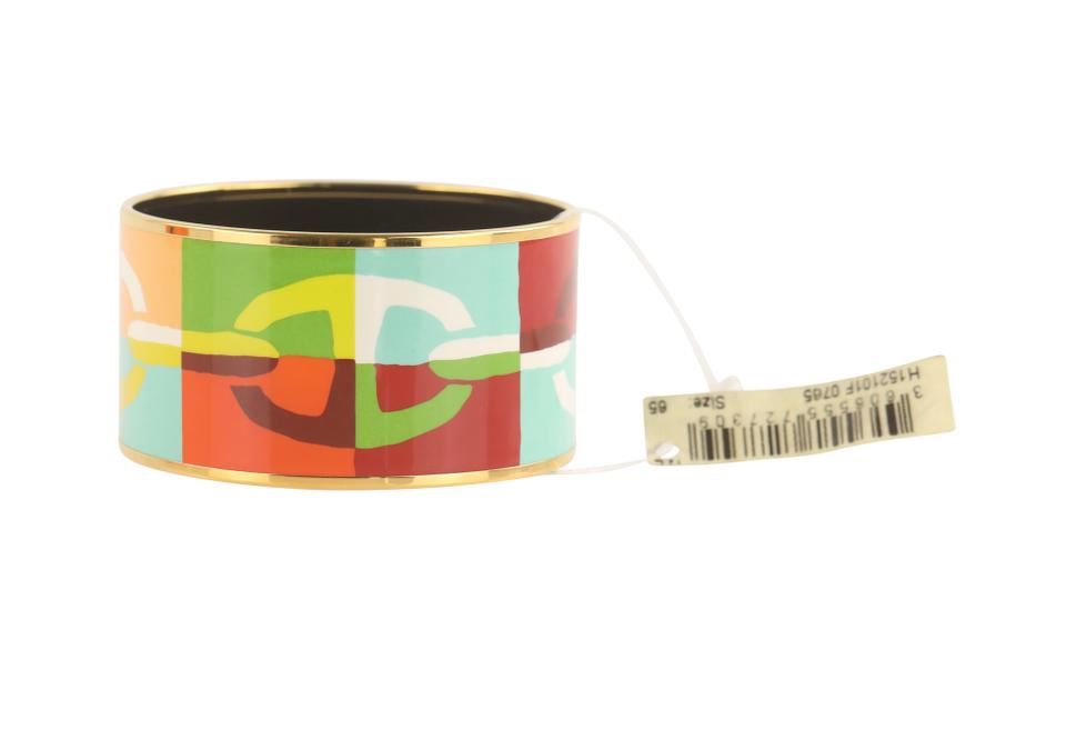 One Hermes Multicolor Chaine Ancre Enamel Wide Bangle Bracelet. Hermes Multicolor Chaine Ancre Enamel Wide Bangle Bracelet Gold-tone hardware embellish the edges of this bracelet Diameter .." Circumference .." Enamel inlay with chain motif Slip on style Band is ." wide Stamped Made in France