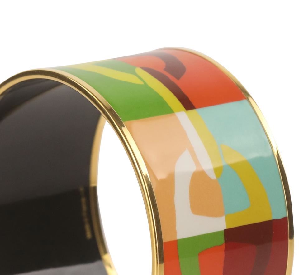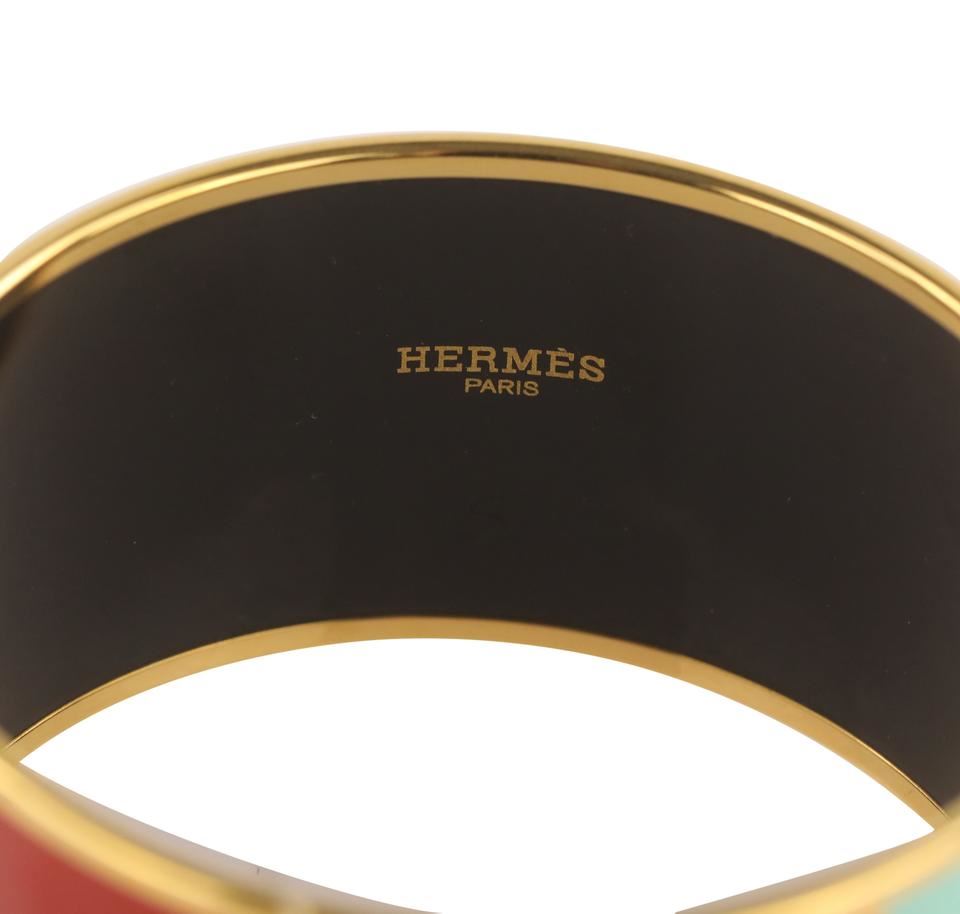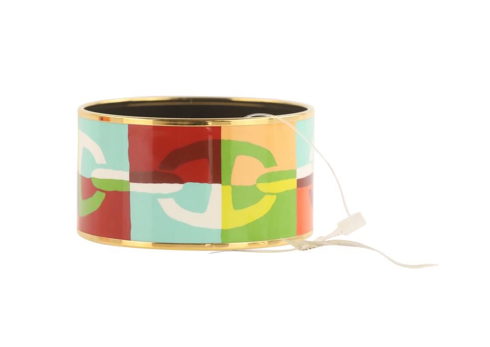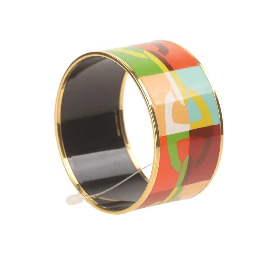 One Hermes Multicolor Chaine Ancre Enamel Wide Bangle Bracelet. Hermes Multicolor Chaine Ancre Enamel Wide Bangle Bracelet Gold-tone hardware embellish the edges of this bracelet Diameter .." Circumference .." Enamel inlay with chain motif Slip on style Band is ." wide Stamped Made in France