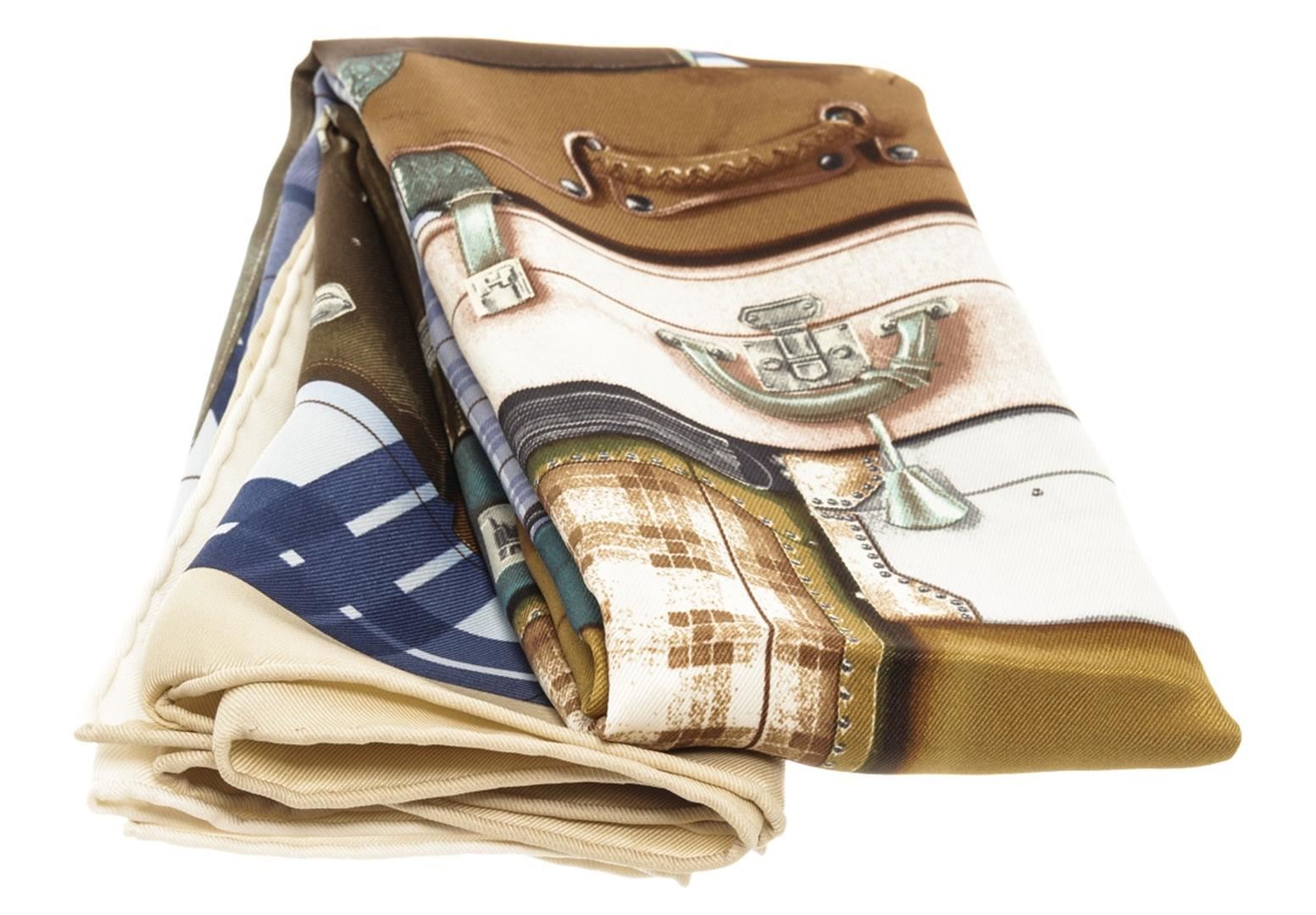 One Hermes Multicolor H en Voyage 70 Silk Scarf. Item is sold AS-IS. All available information is listed in the description and shown in the photo. hermes multicolor h en voyage 70 silk scarf with a veritable monolith of hermes luggage. Width: 27.56" Length: 27.56