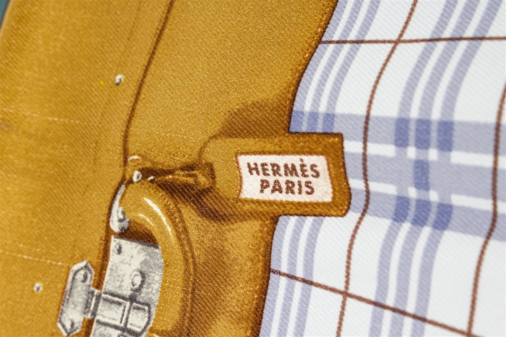 One Hermes Multicolor H en Voyage 70 Silk Scarf. Item is sold AS-IS. All available information is listed in the description and shown in the photo. hermes multicolor h en voyage 70 silk scarf with a veritable monolith of hermes luggage. Width: 27.56" Length: 27.56