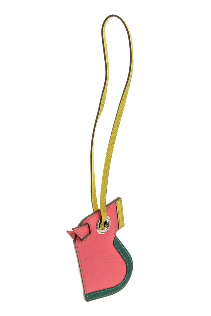 One Hermes Multicolor Leather Camail Bag Charm. Item is sold AS-IS. All available information is listed in the description and shown in the photo. Hermes multicolor leather Camail bag charm with pink, yellow, and green leather exterior with green stitching, yellow strap, silver-tone hardware, eyelet where the strap goes, keychain ring, and orange leather lining. SC