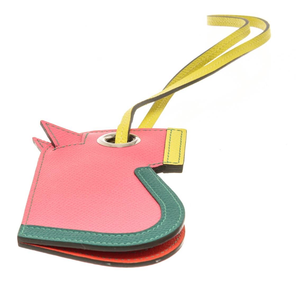 One Hermes Multicolor Leather Camail Bag Charm. Item is sold AS-IS. All available information is listed in the description and shown in the photo. Hermes multicolor leather Camail bag charm with pink, yellow, and green leather exterior with green stitching, yellow strap, silver-tone hardware, eyelet where the strap goes, keychain ring, and orange leather lining. SC