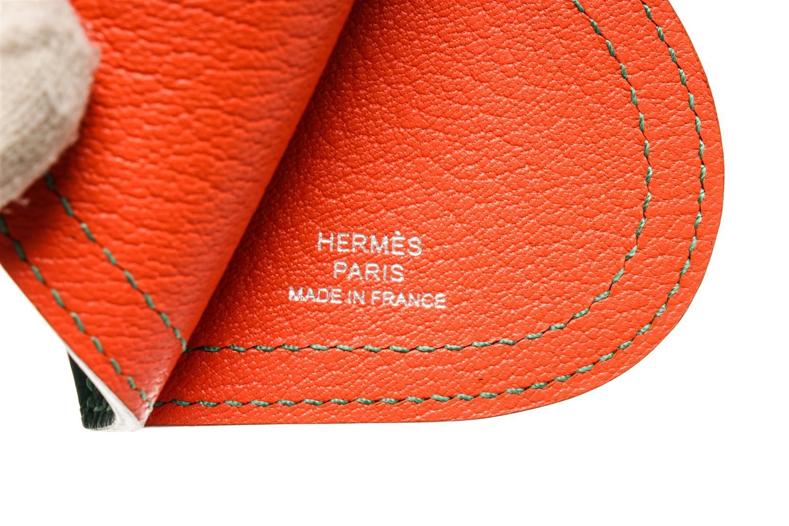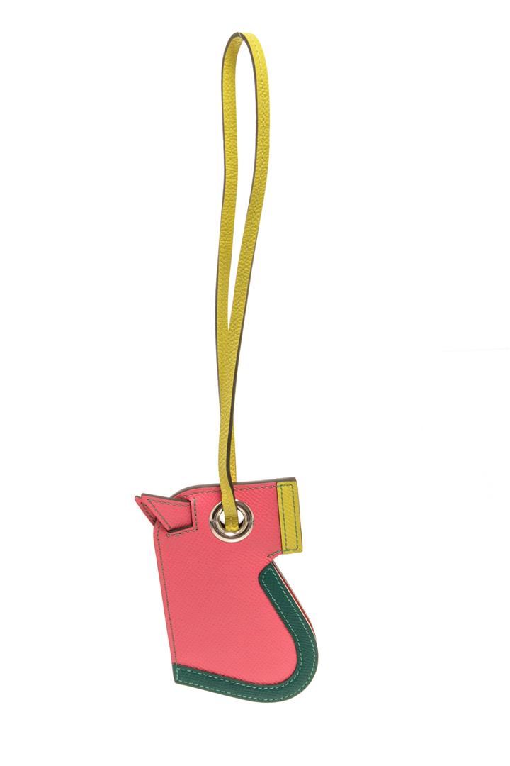 One Hermes Multicolor Leather Camail Bag Charm. Item is sold AS-IS. All available information is listed in the description and shown in the photo. Hermes multicolor leather Camail bag charm with pink, yellow, and green leather exterior with green stitching, yellow strap, silver-tone hardware, eyelet where the strap goes, keychain ring, and orange leather lining. SC