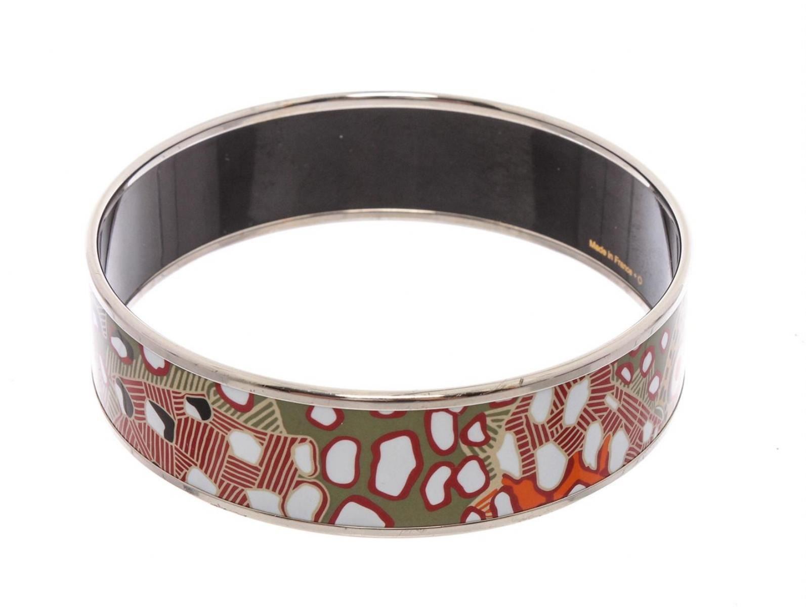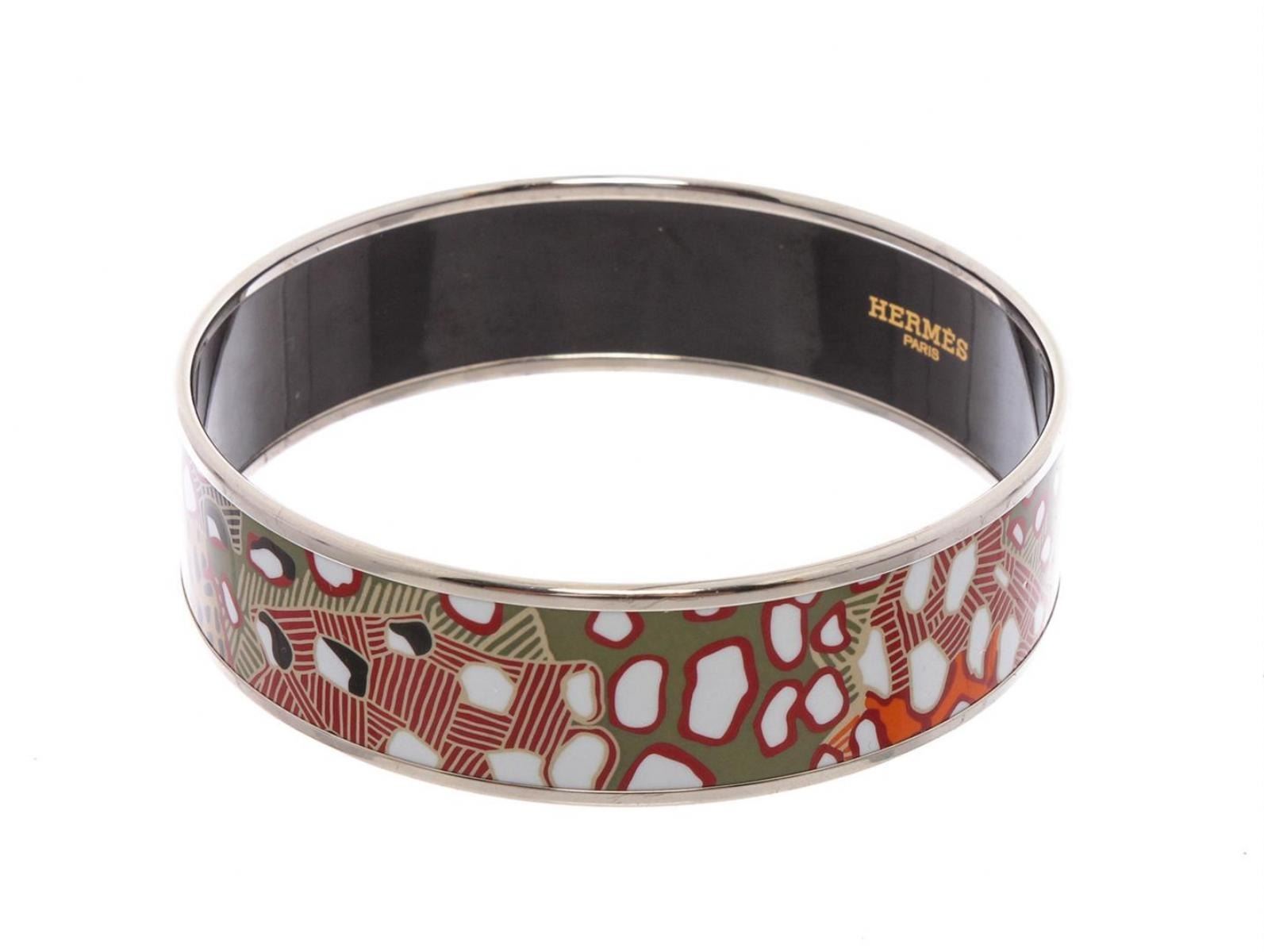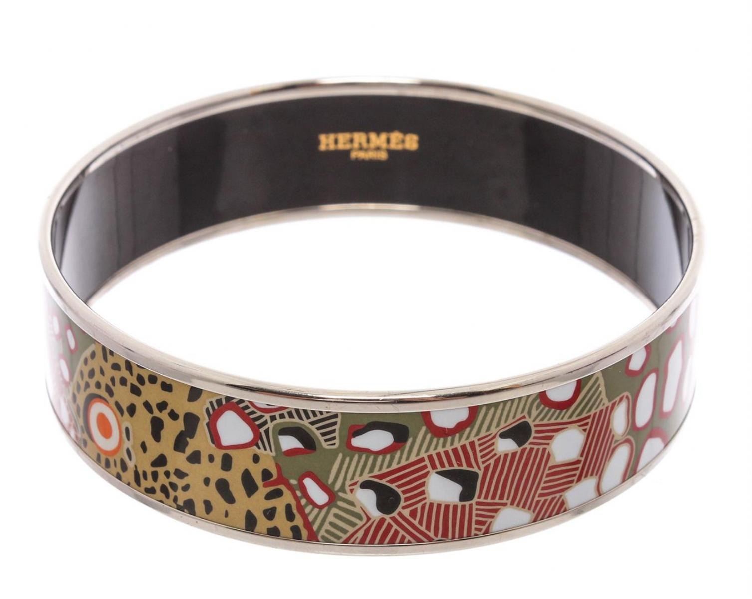 Multicolor Palladium-plated Hermès Wide printed enamel bangle. Includes jewelry pouch. Designer size 70.
