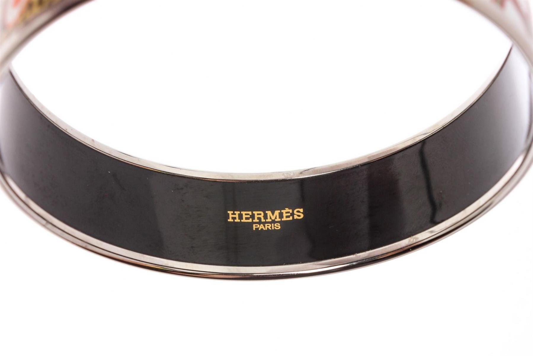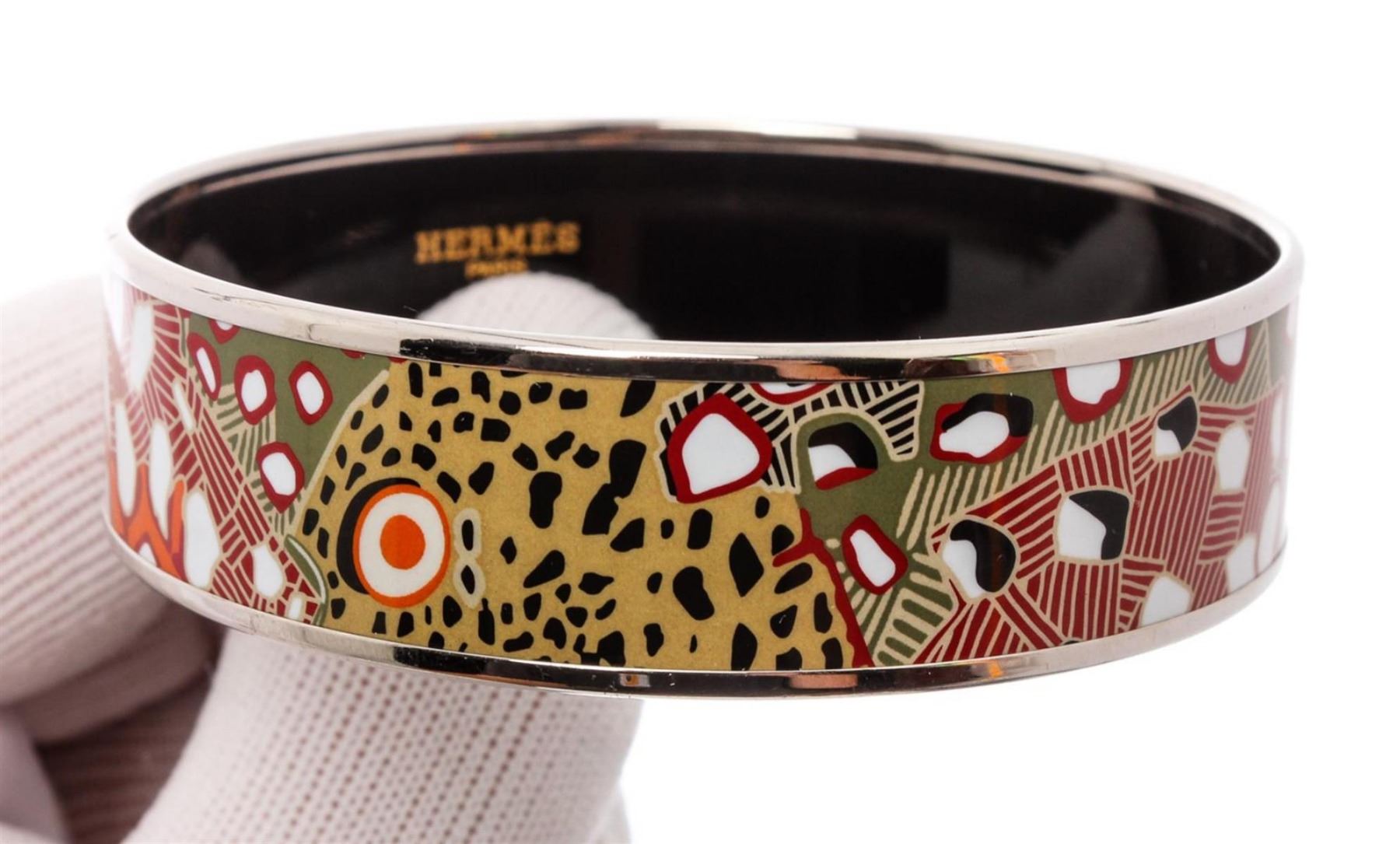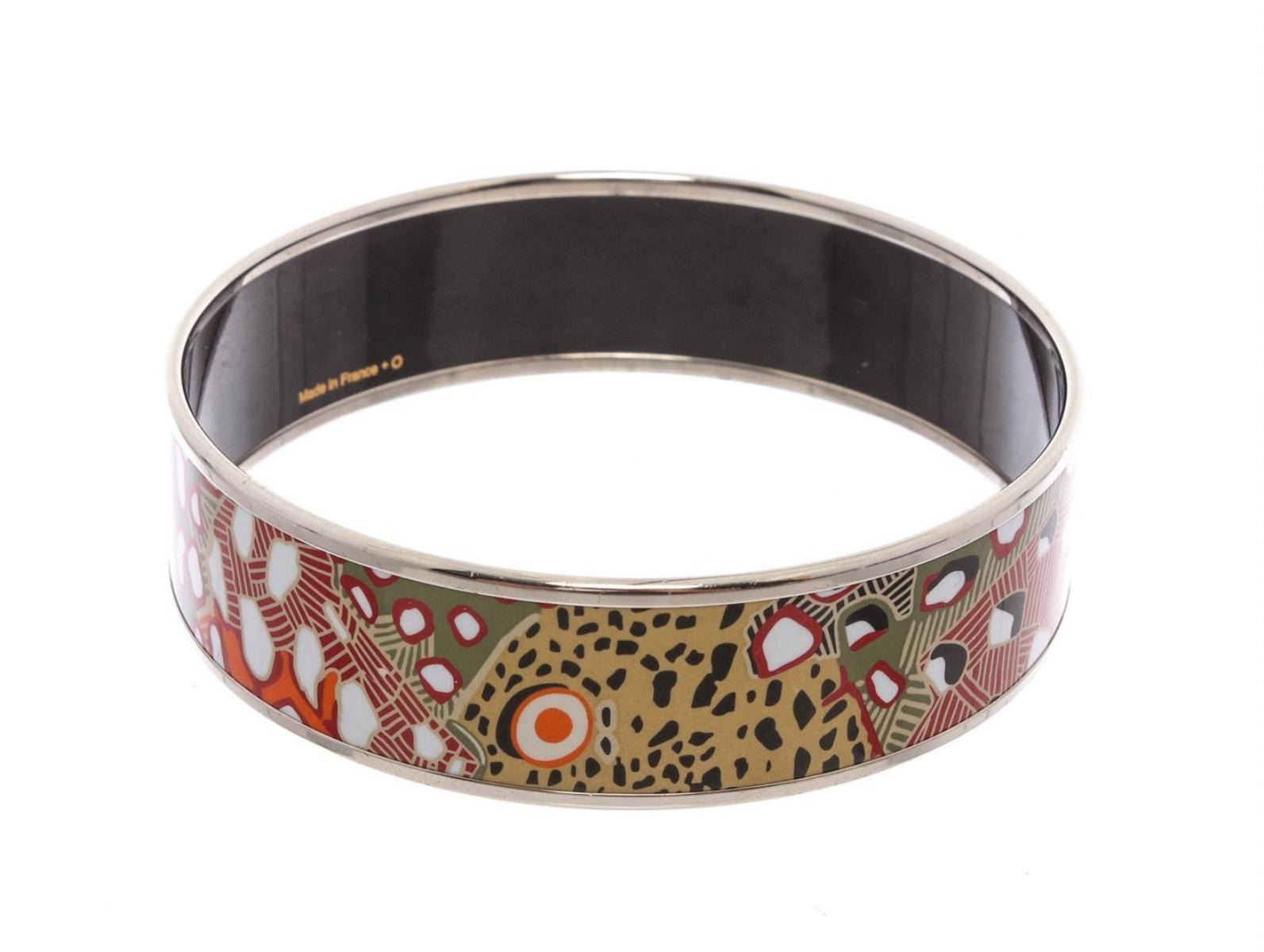 Multicolor Palladium-plated Hermès Wide printed enamel bangle. Includes jewelry pouch. Designer size 70.