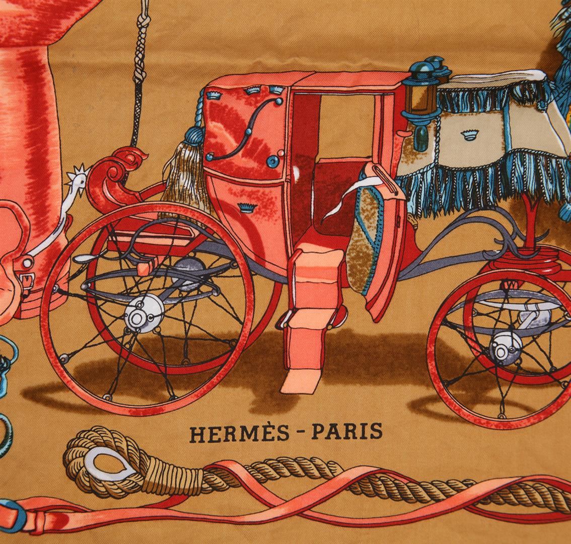 One Hermes cotton scarf in good condition, measuring 60cm by 60cm. The scarf features the 'Musee' design by artist Philippe Ledoux. The design features various nautical themed items framed by braided rope and chains, set against a dark beige background. Comes with an Hermes scarf box.
