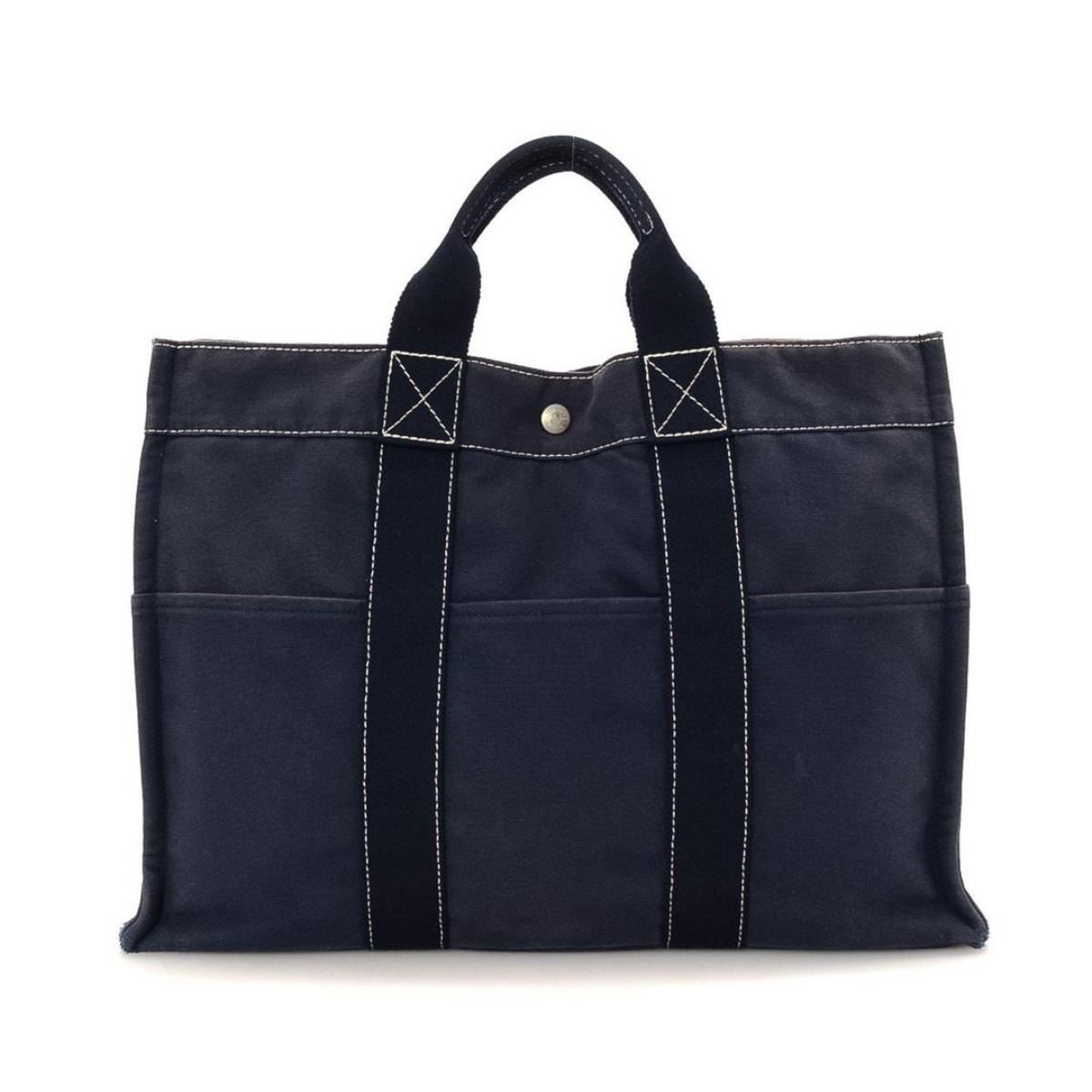 Hermes Navy Canvas Fourre MM Tout Bag with stripe canvas handles, interior zip pocket, three exterior slip pockets on front and back, side snap pocket, and snap closure. Measurements: Length: 4 in / 10 cm Width: 16.25 in / 41 cm 12 in / 30 cmCONDITION: Pre-Owned Good overall, please see photographs for detail.