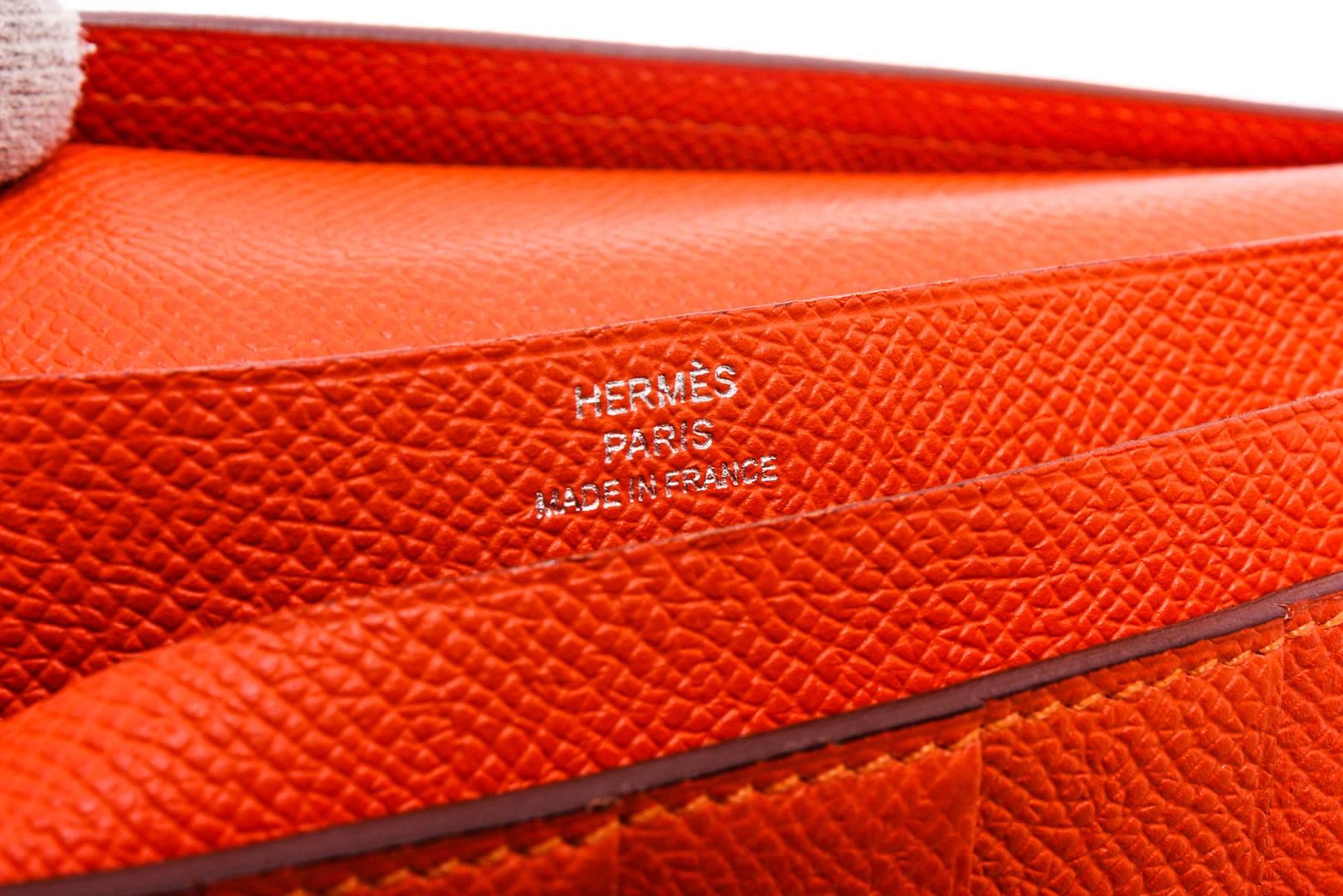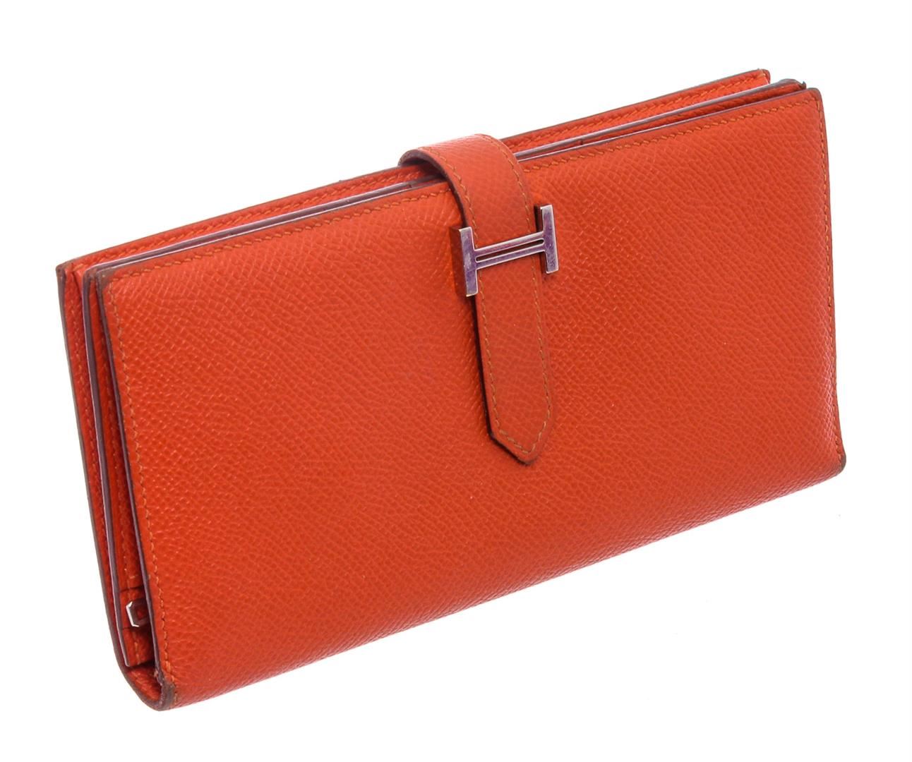 One Hermes Orange Epsom Leather Bearn Wallet. Orange Epsom leather Hermès Bearn wallet with palladium-plated hardware, tonal leather lining, four interior bill compartments, single interior zip coin compartment, five interior card slots and pull-through closure at front flap featuring 'H' logo adornment.