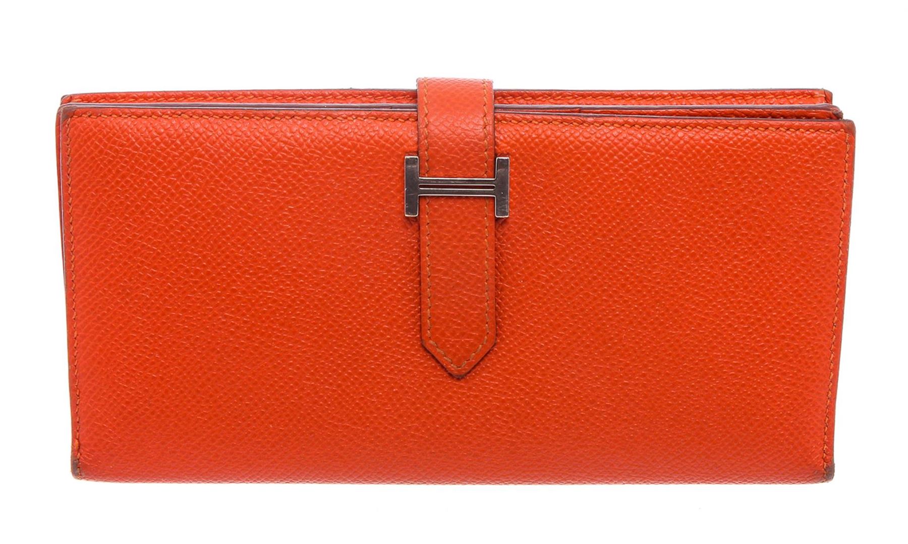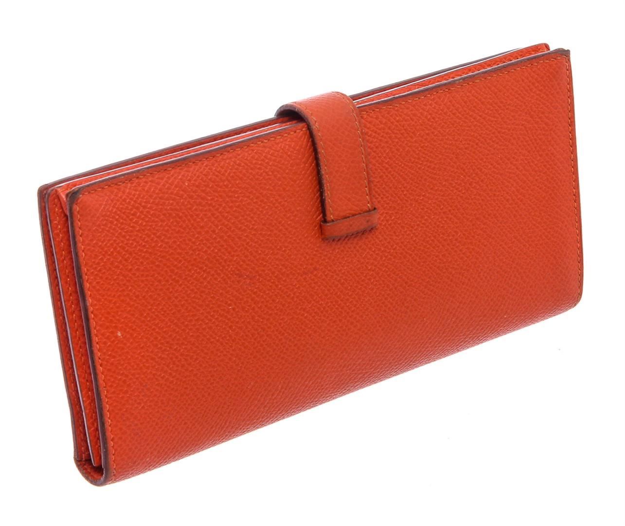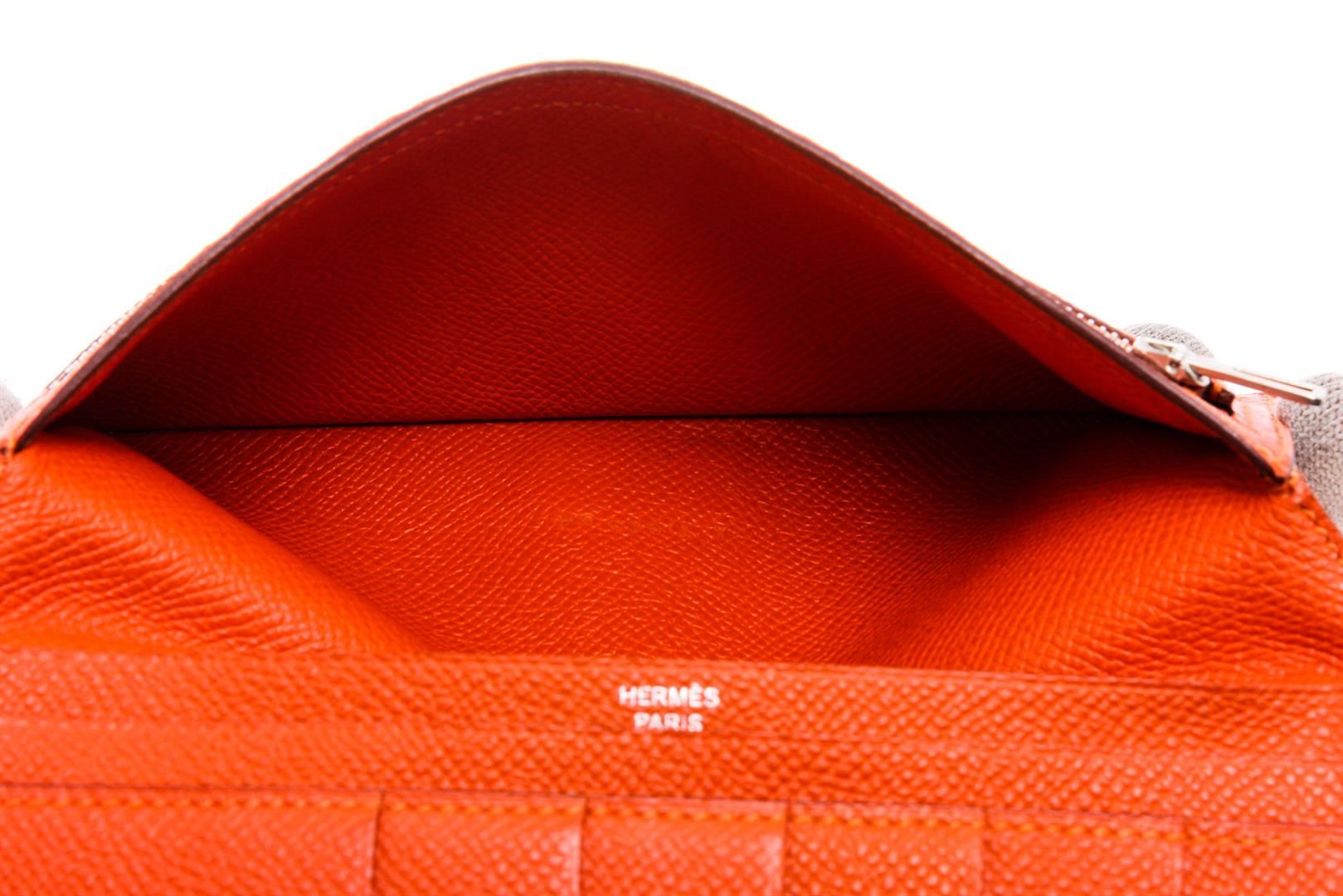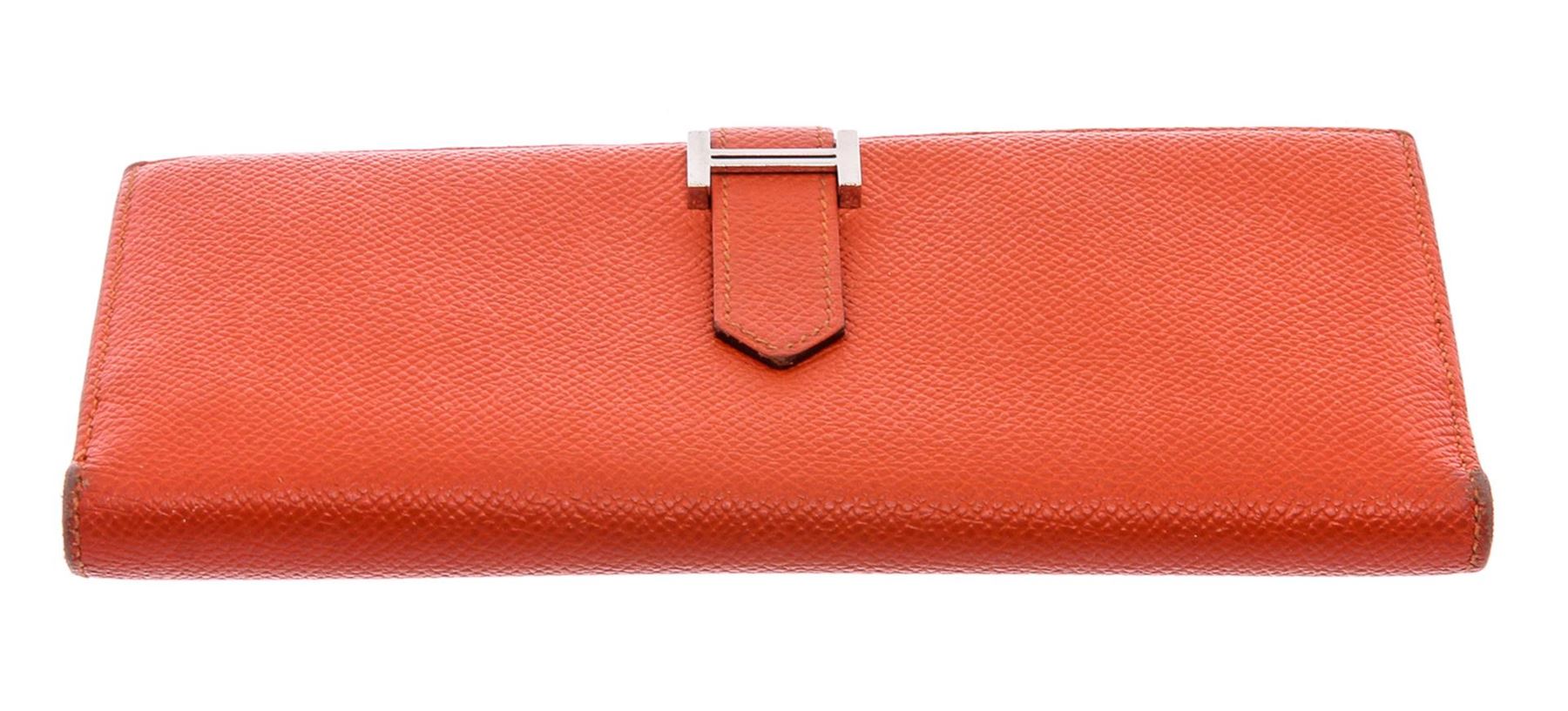 One Hermes Orange Epsom Leather Bearn Wallet. Orange Epsom leather Hermès Bearn wallet with palladium-plated hardware, tonal leather lining, four interior bill compartments, single interior zip coin compartment, five interior card slots and pull-through closure at front flap featuring 'H' logo adornment.