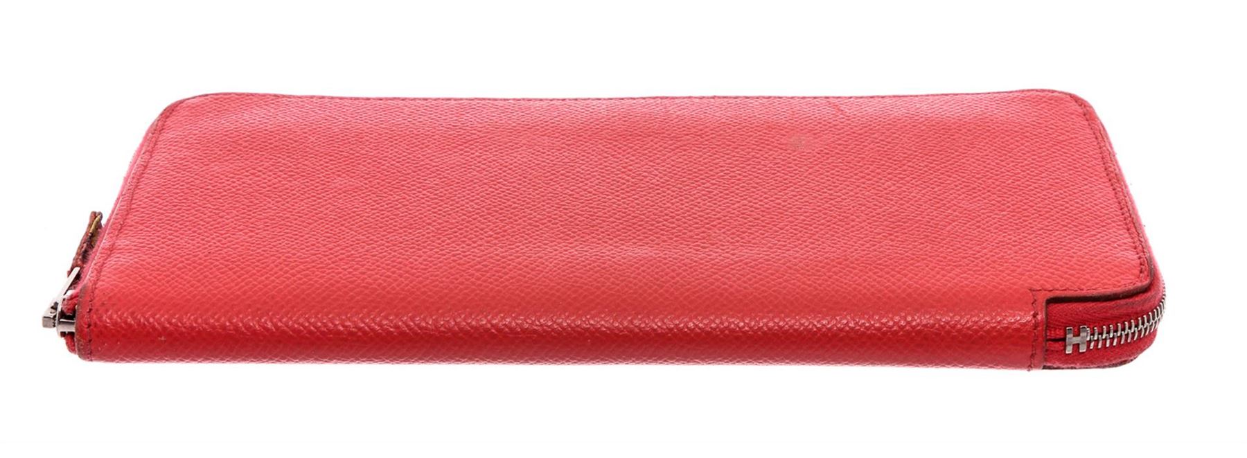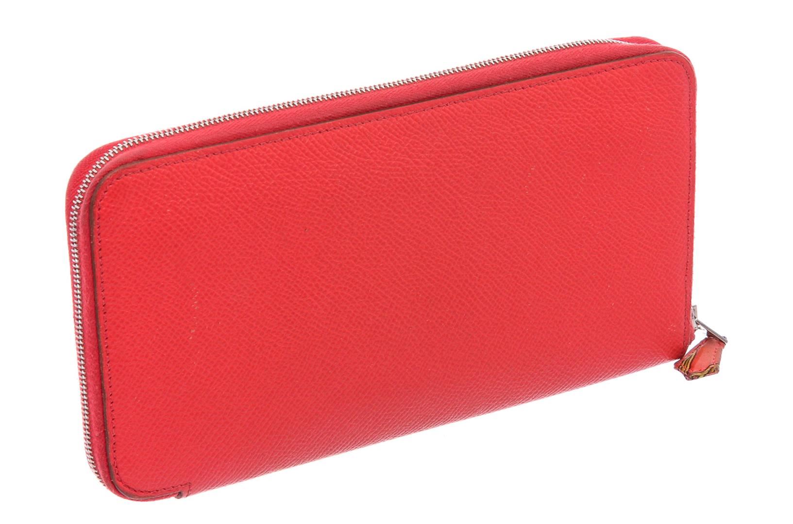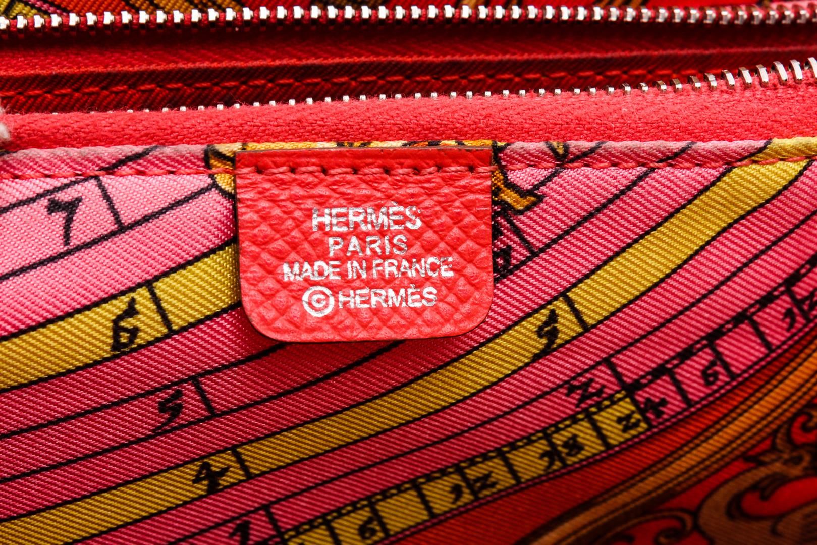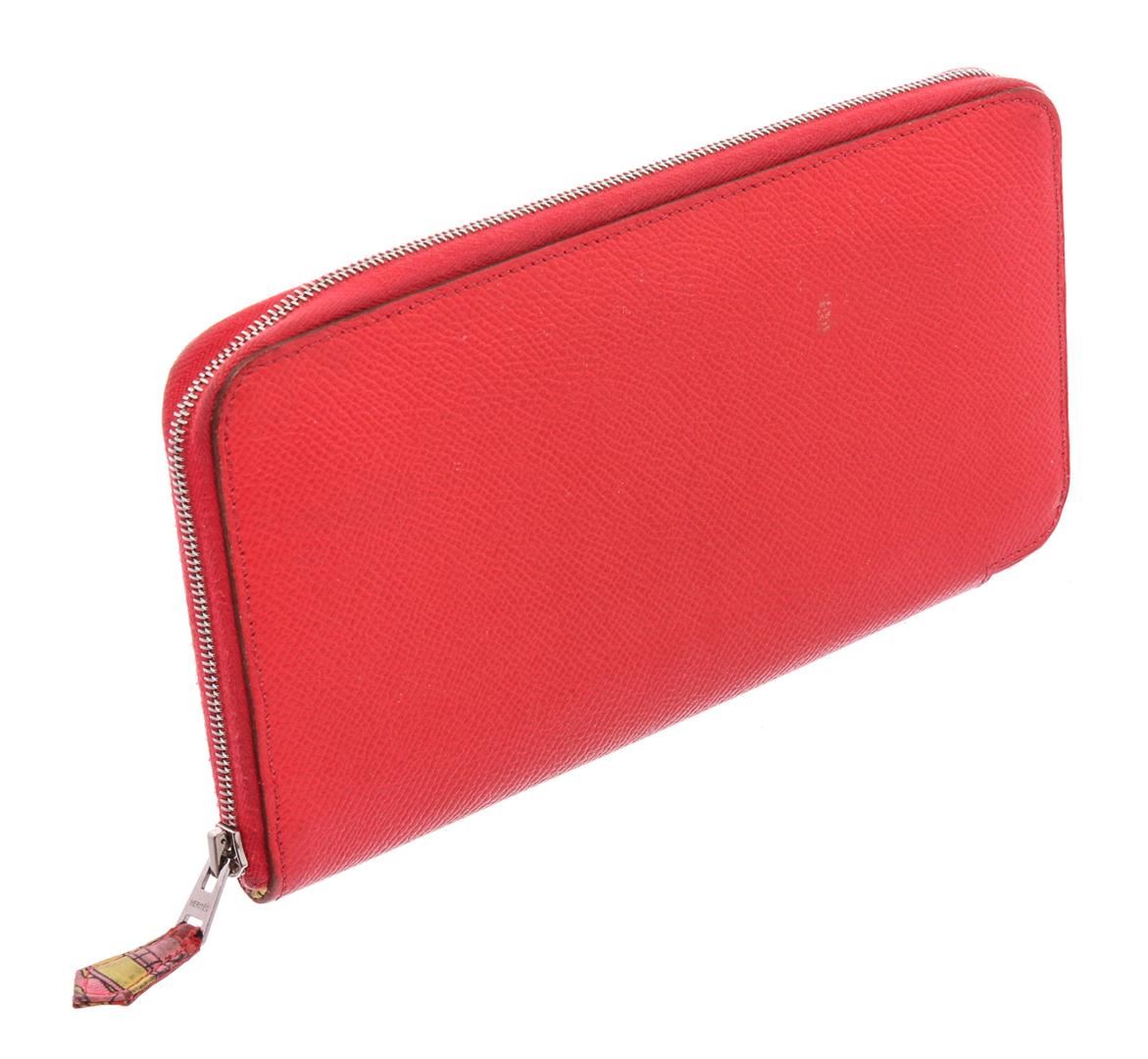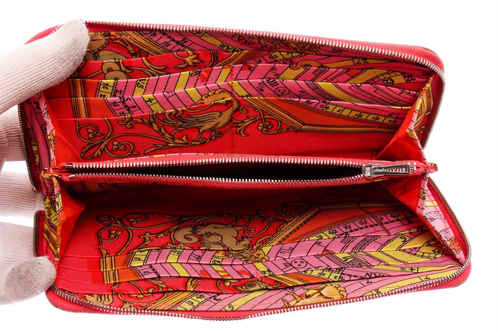 Orange Epsom leather Hermès Silk'In Classic wallet with palladium-plated hardware, multicolor Les Sangles motif silk lining, three interior compartments; one with zip closure, dual interior bill compartments, 12 card slots and zip-around closure.