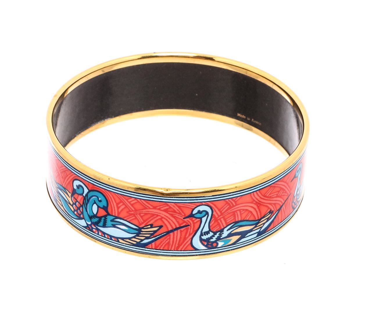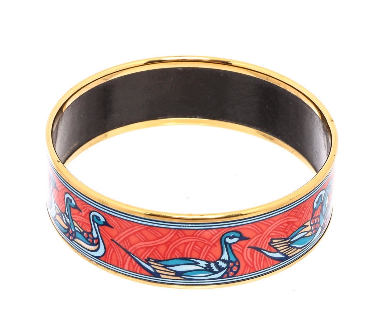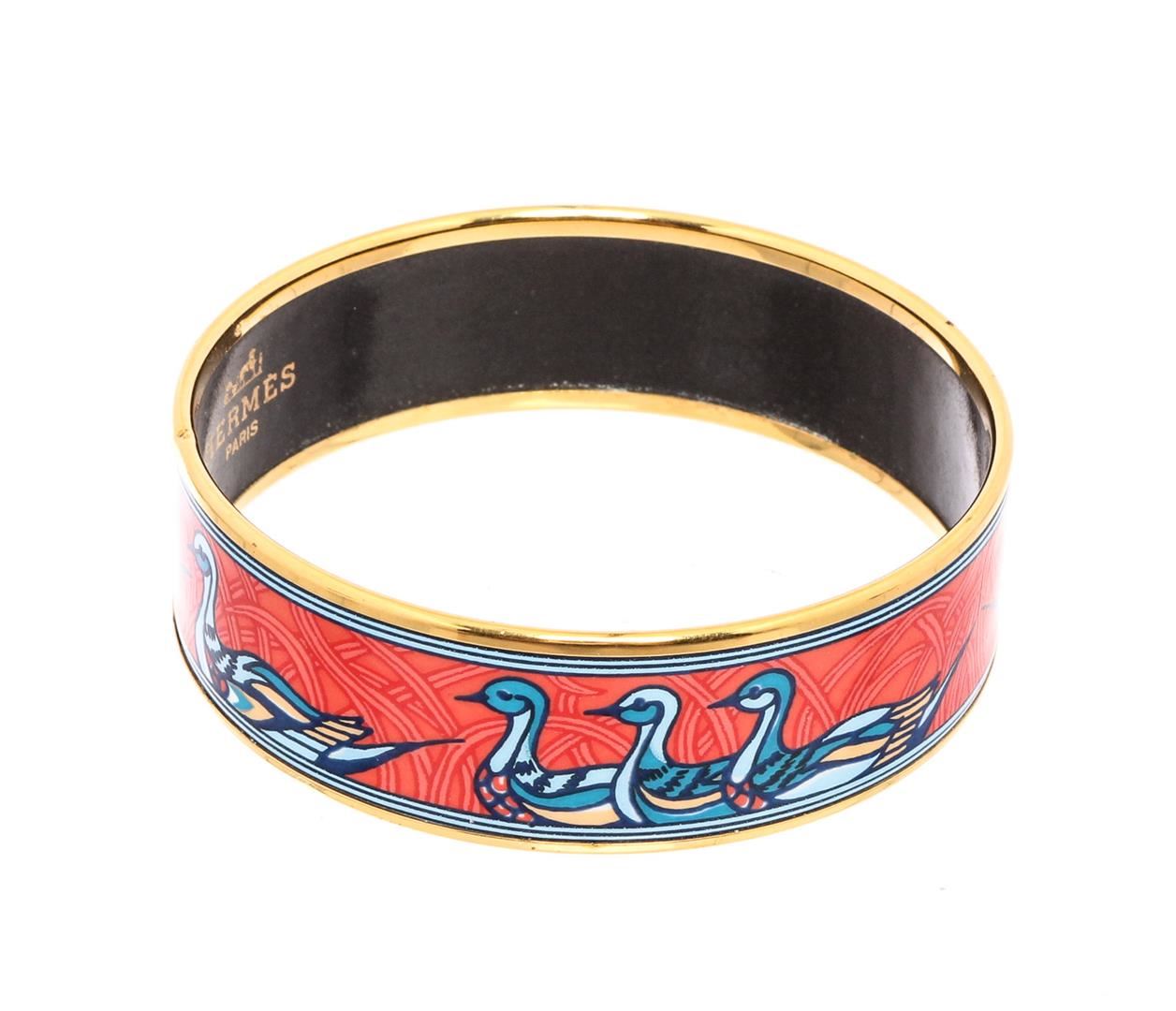 Hermes gold plated orange multicolor enamel duck print bangle bracelet.