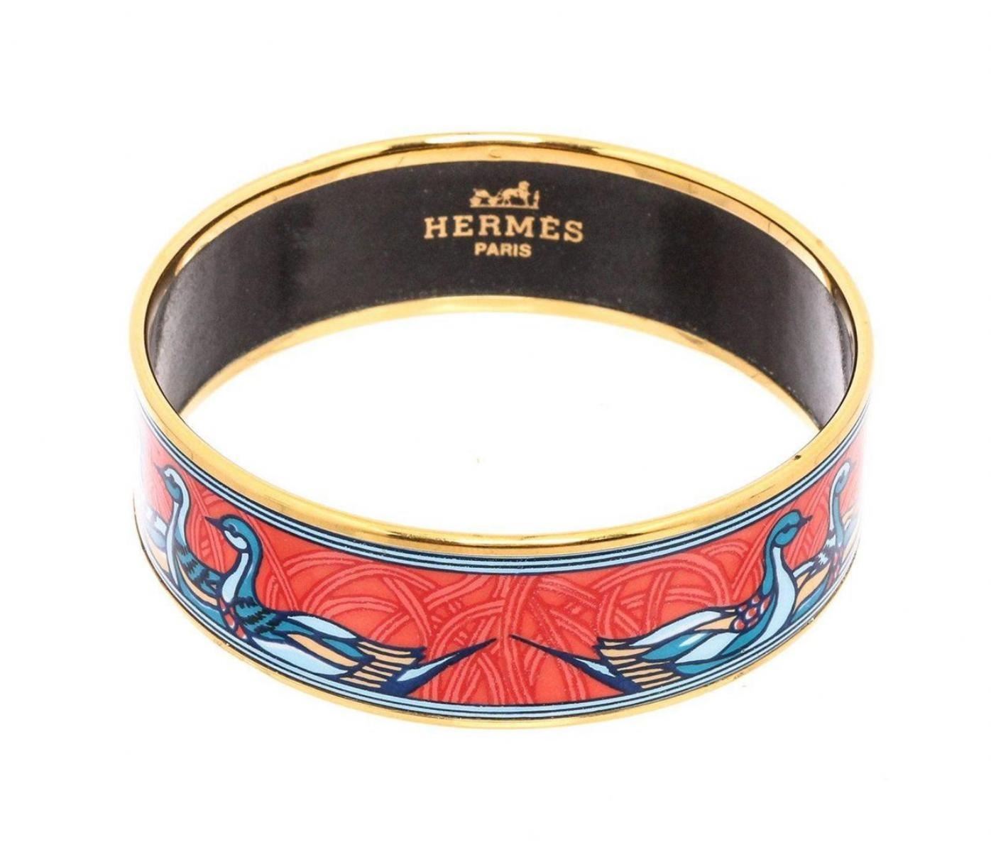 Hermes gold plated orange multicolor enamel duck print bangle bracelet. Measurements: Diameter 2.5 in / 6 cm Height 2.5 in / 6 cm CONDITION: Pre-Owned Good overall condition. Please refer to photographs.