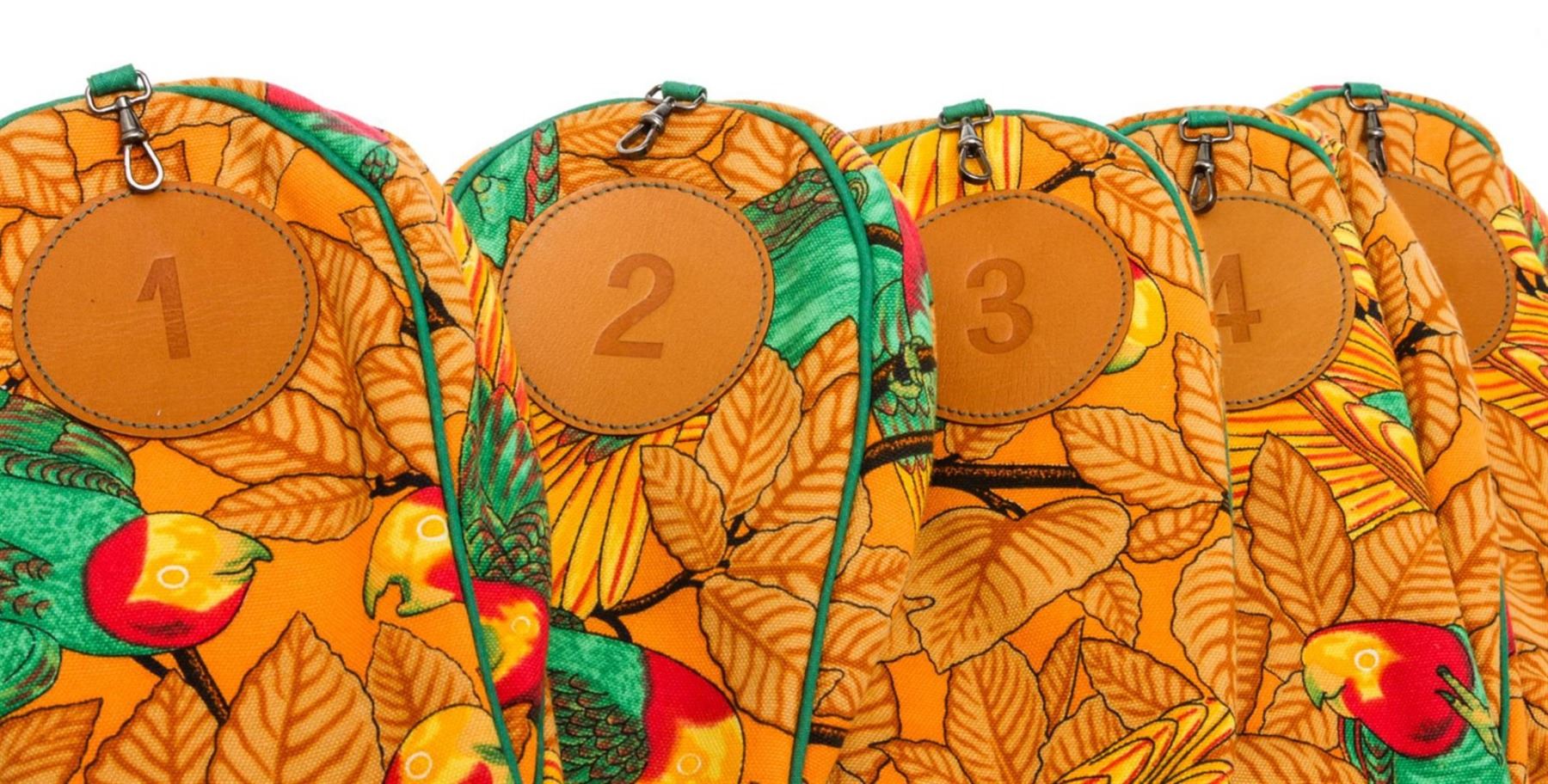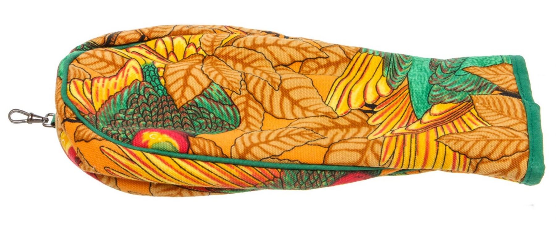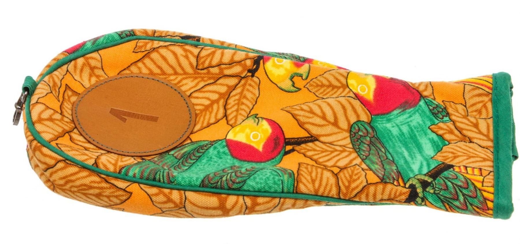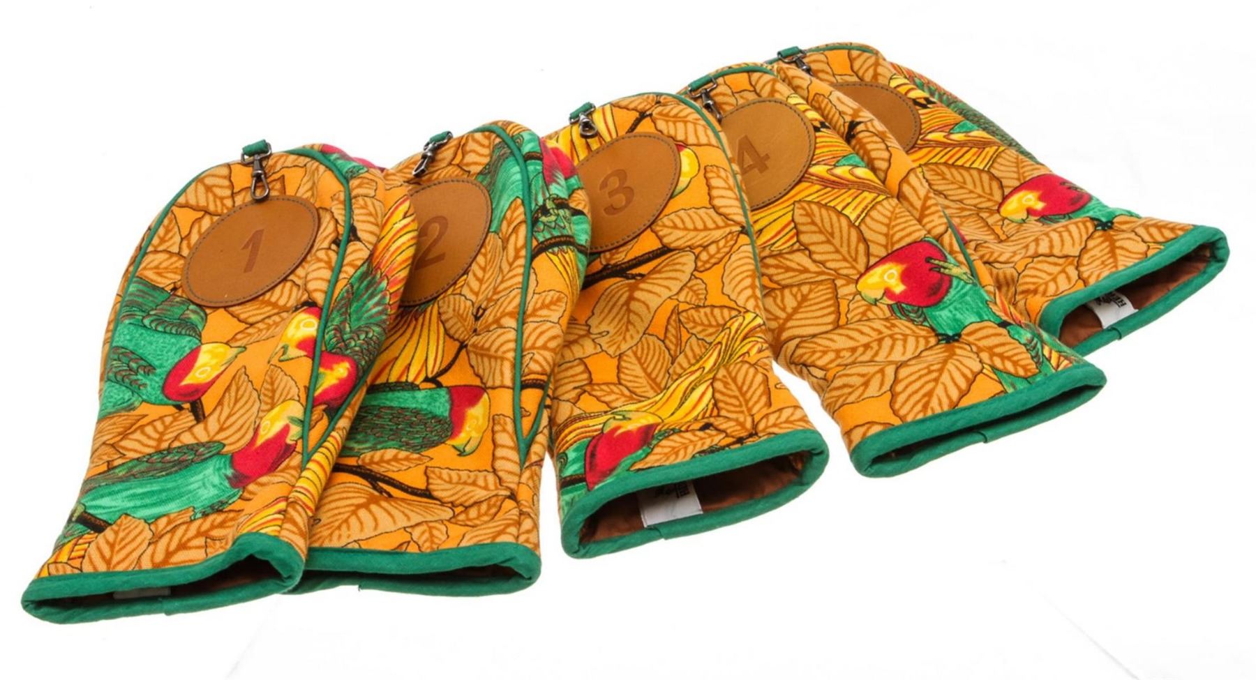 One Hermes Orange Multicolor Tropical Print Vintage Golf Club Head Cover Set. Crafted out of multicolor tropical print fabric with gun-metal hardware. This set contains five gold club head covers. MKR