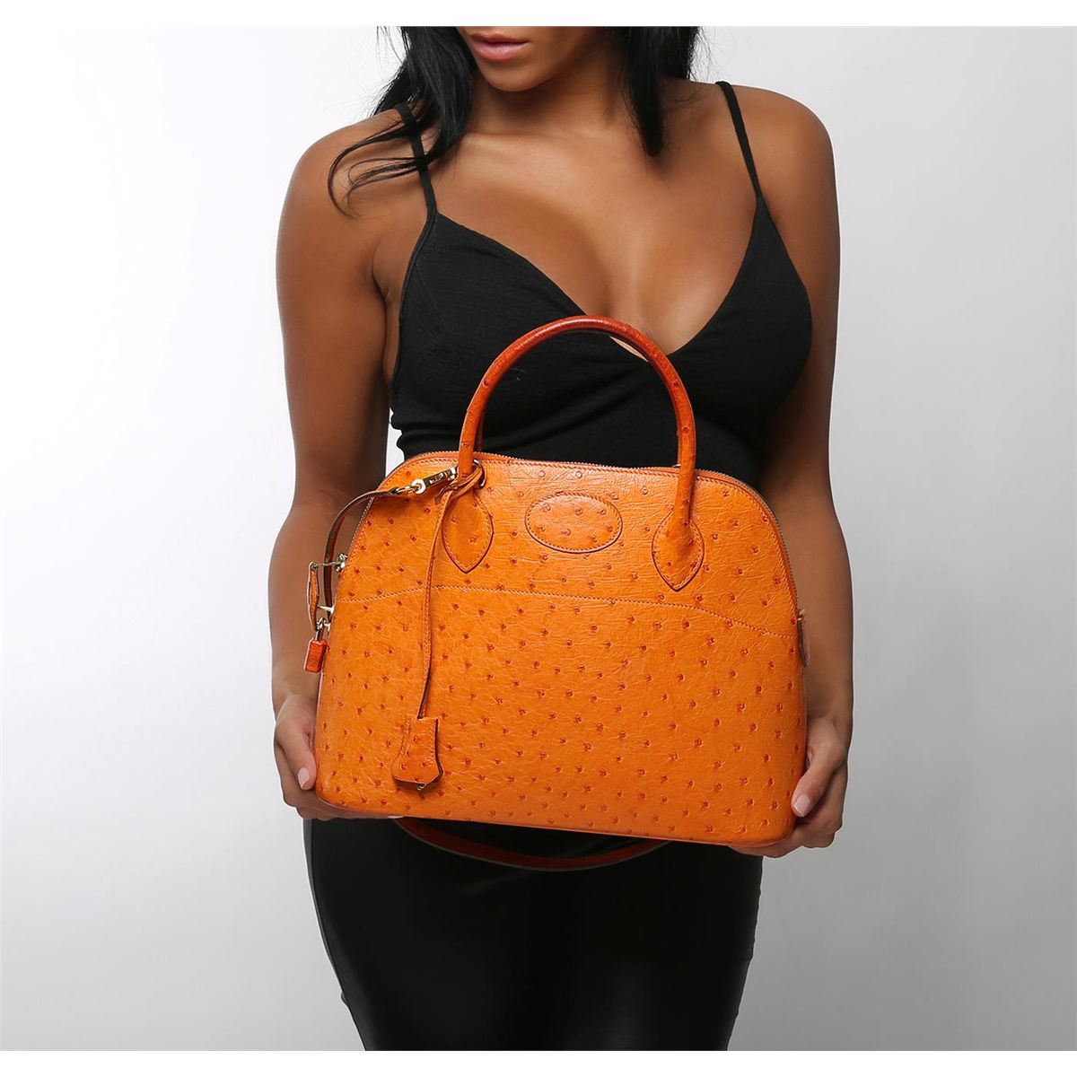 One Hermes ostrich bolide handbag featuring: ostrich exterior, leather interior, orange exterior & interior, gold toned hardware, overall zipper closure and measures 12.25" w x 5" d.