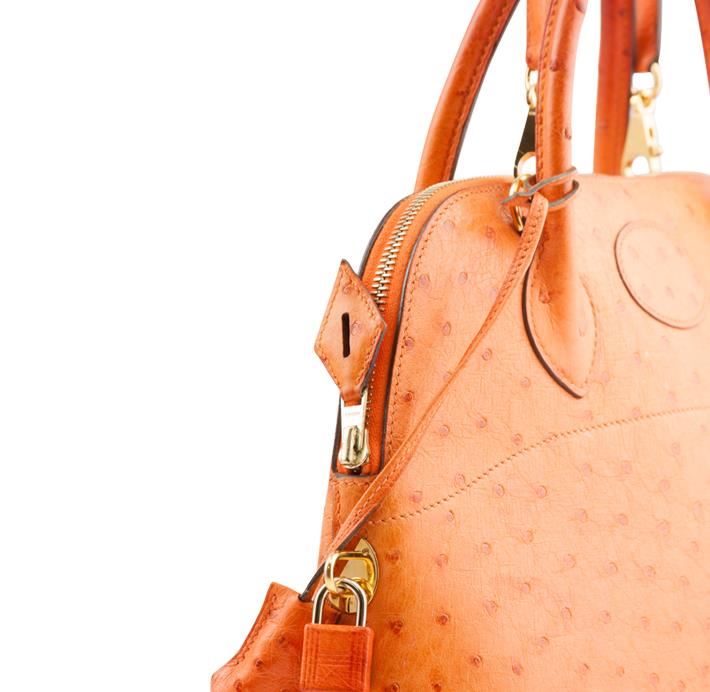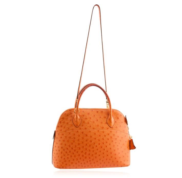 One Hermes ostrich bolide handbag featuring: ostrich exterior, leather interior, orange exterior & interior, gold toned hardware, overall zipper closure and measures 12.25" w x 5" d.