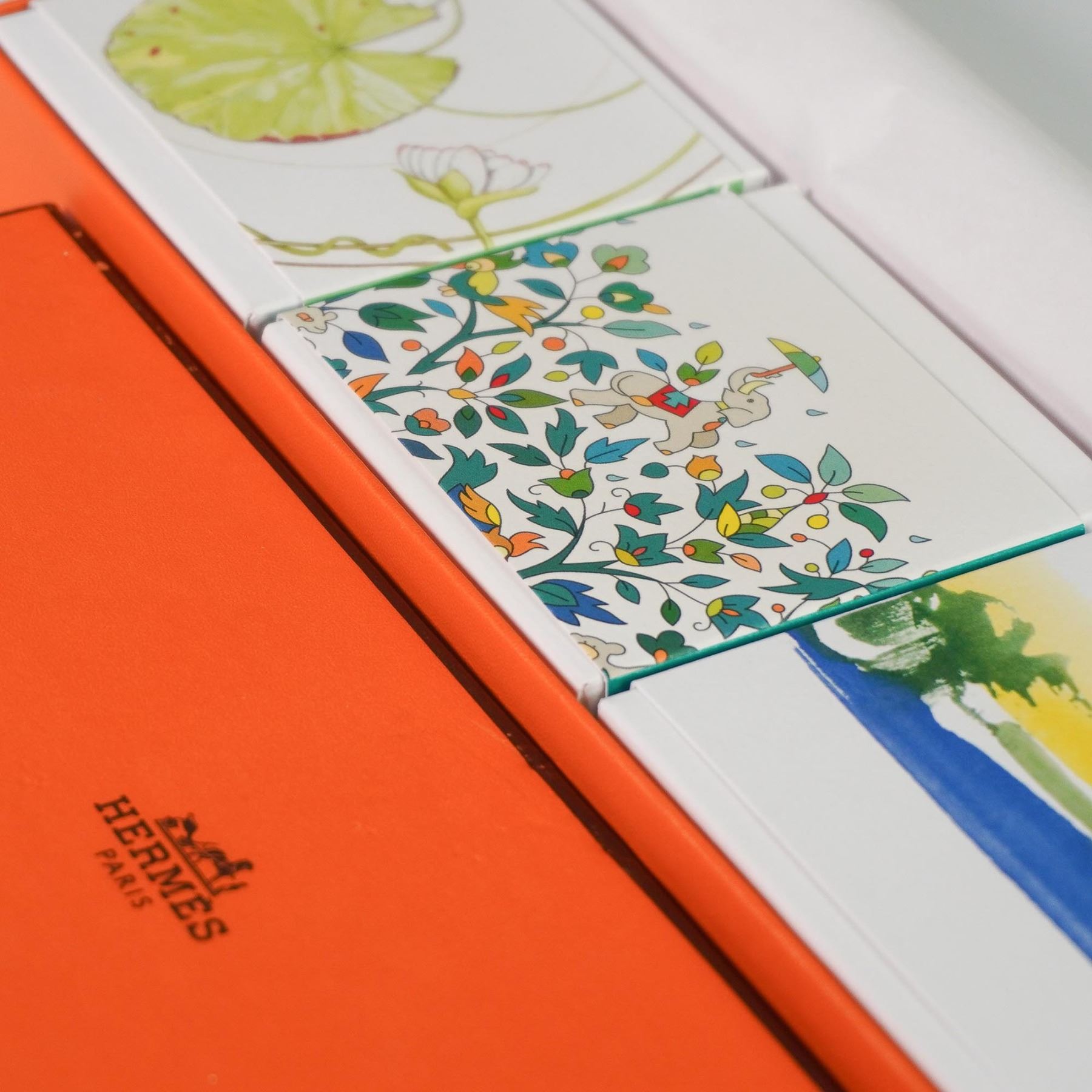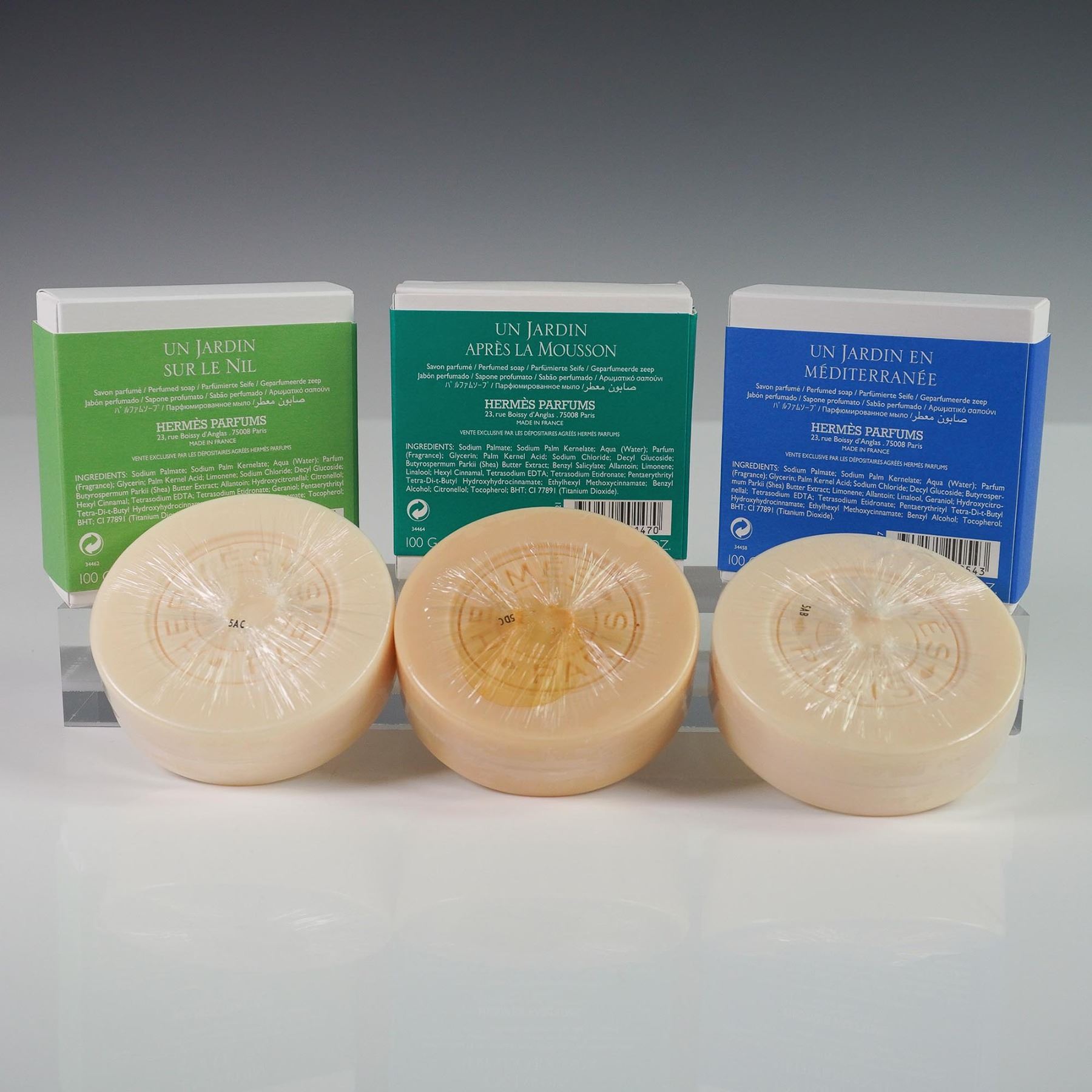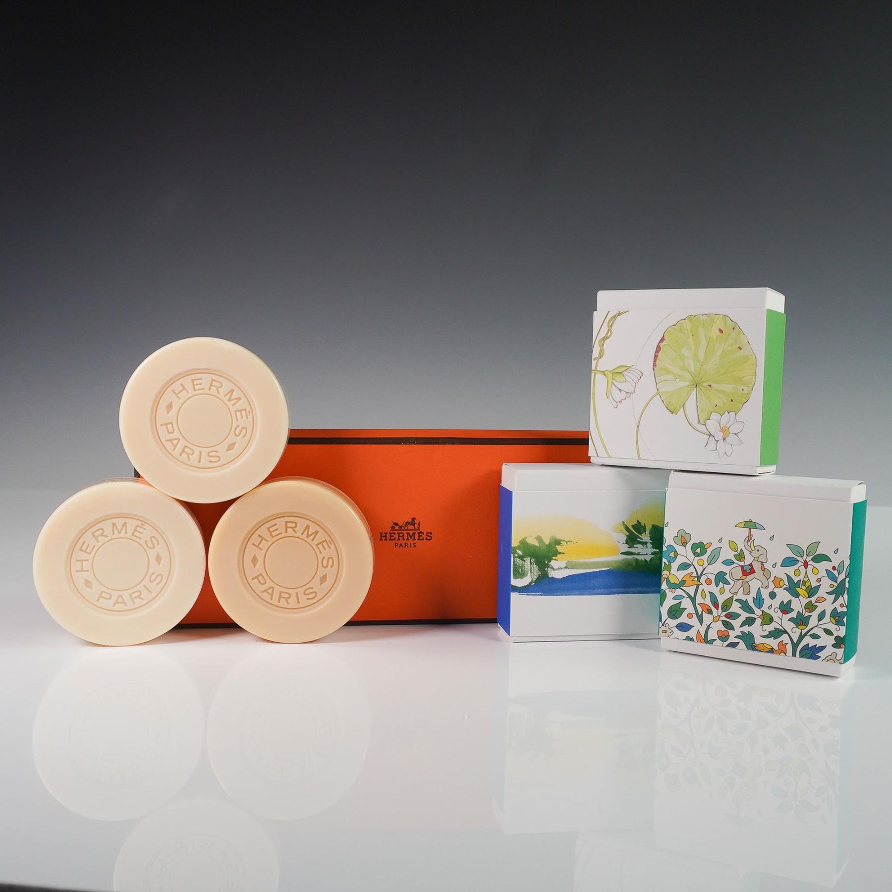 A luxurious trio of Hermes Paris scented soaps from the Un Jardin Collection, presented in their original Hermes orange box. This set includes Un Jardin Sur Le Nil, Un Jardin Apres La Mousson, and Un Jardin En Mediterranee, each individually wrapped and housed in illustrated outer sleeves. Each soap measures approximately 100g and is embossed with the Hermes Paris mark. Outer boxes feature delicate watercolor artwork corresponding to each fragrance. The soaps are sealed in their original cellophane and appear unused.