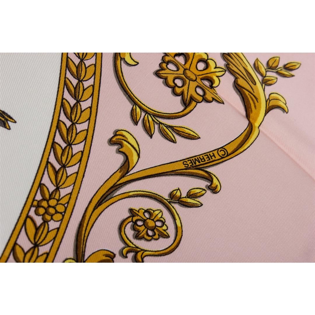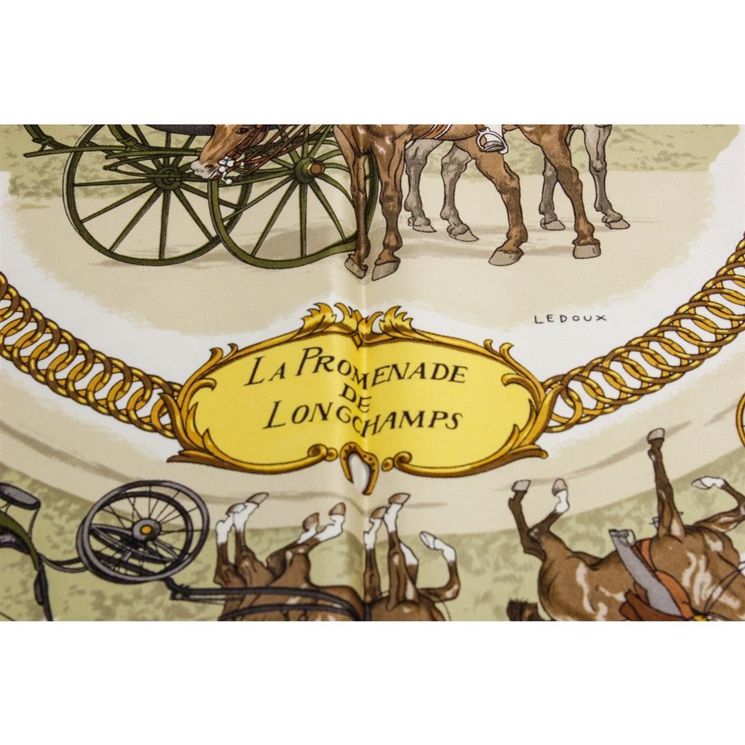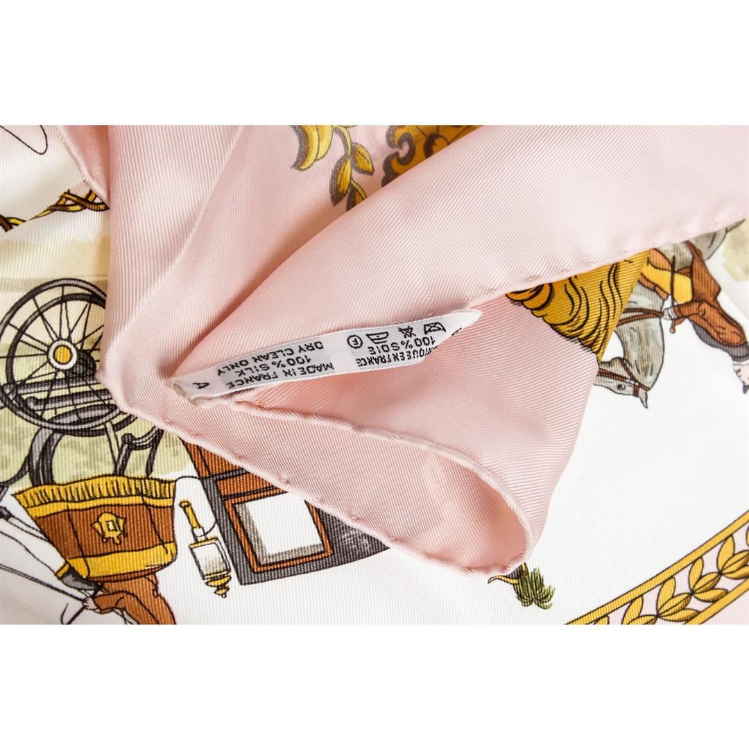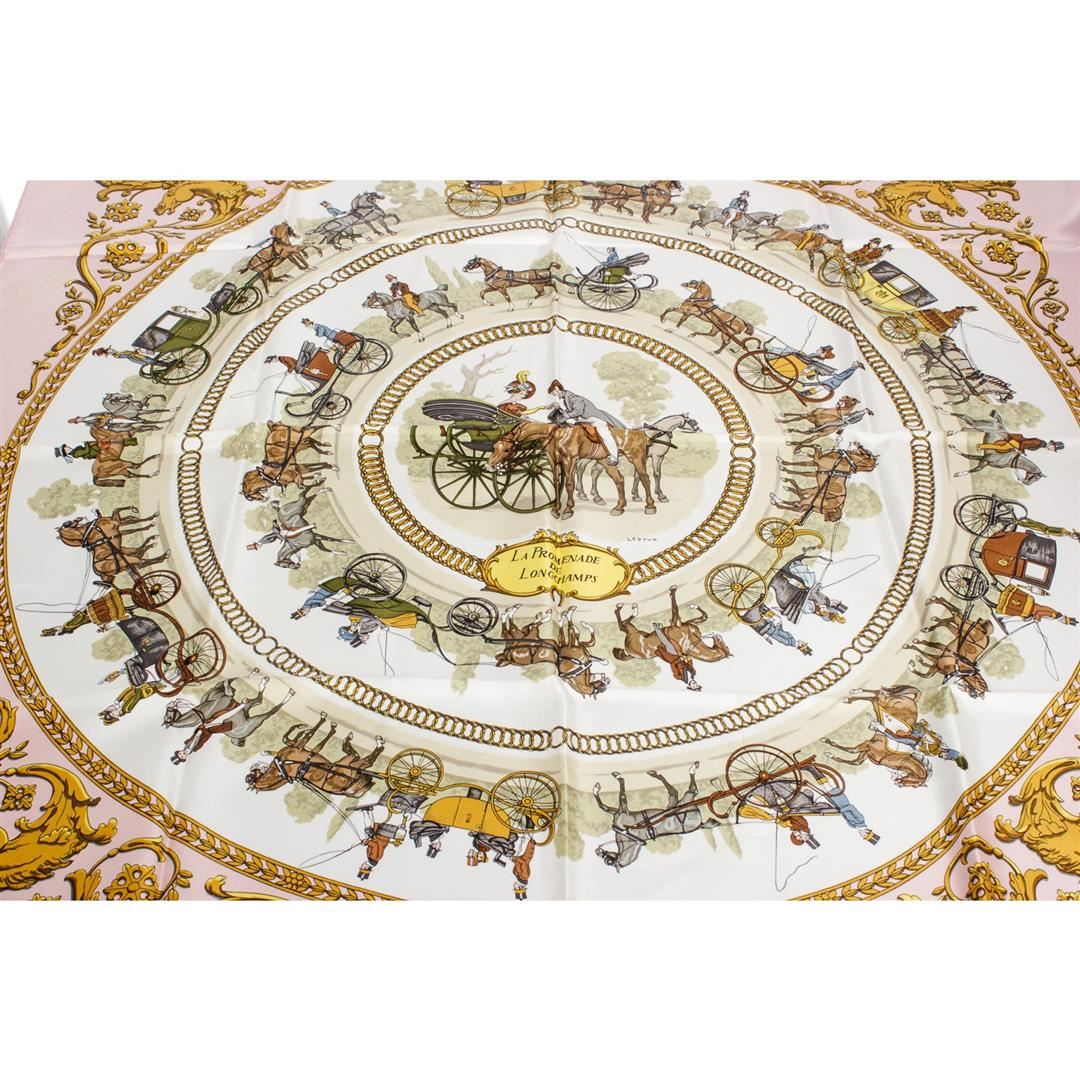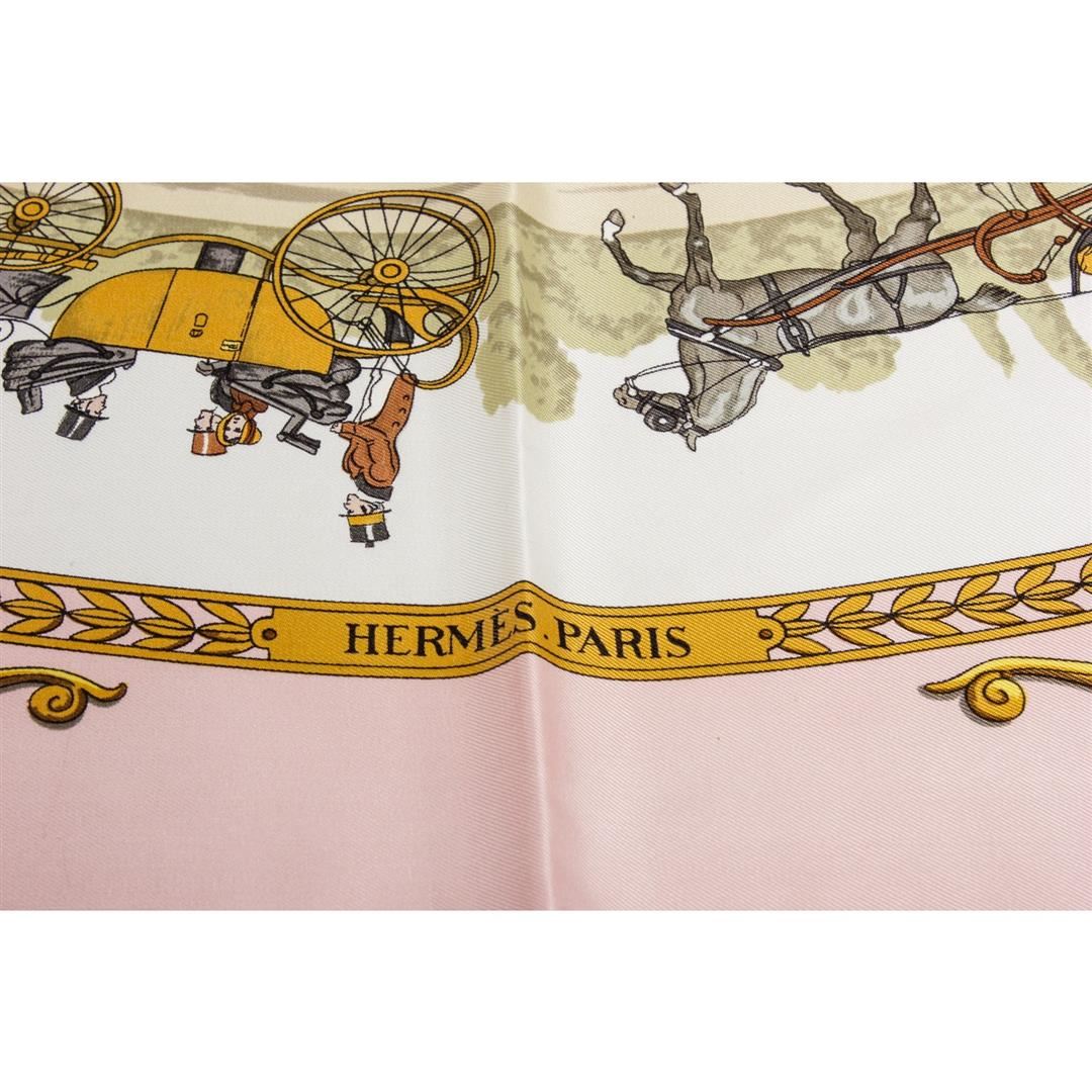 Pink and multicolor Hermes silk scarf with 'La Promenade De Longchamps' motif and hand rolled edges. Please note, there are faint pulls throughout.