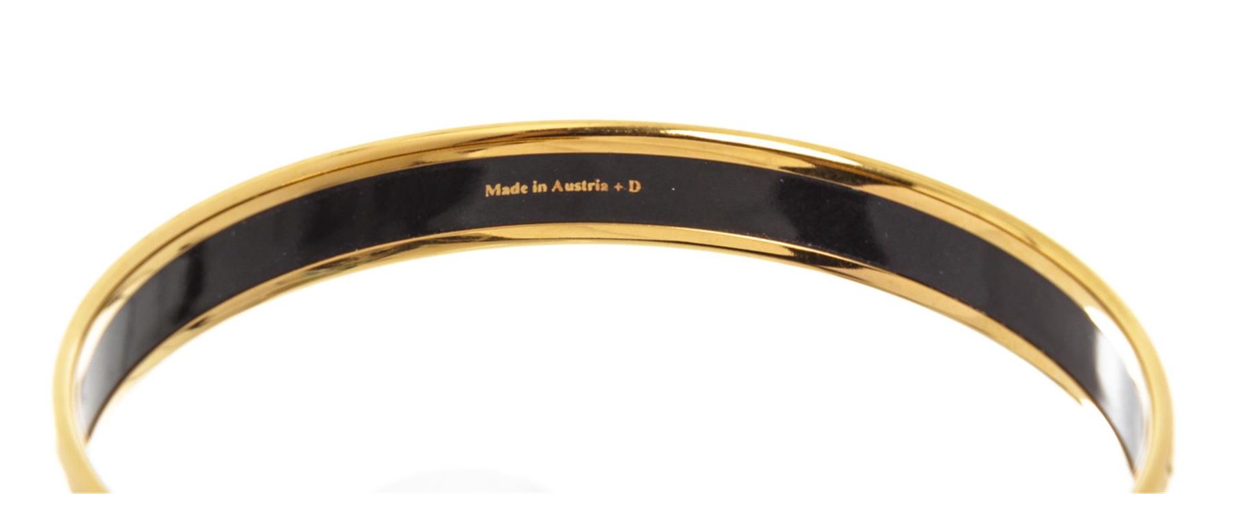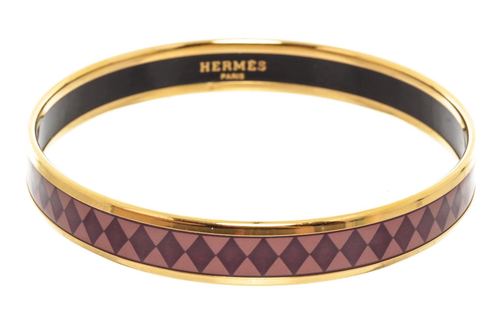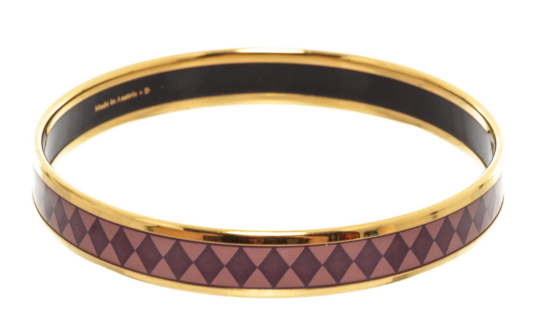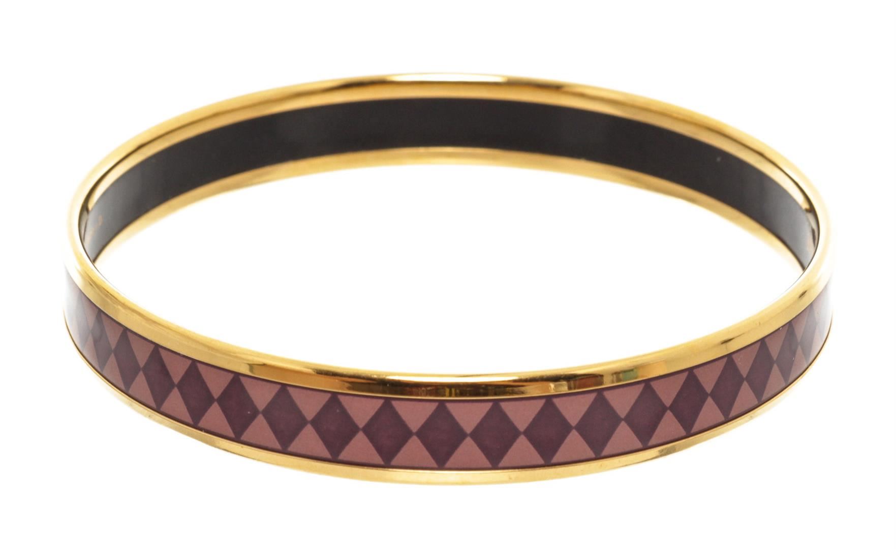 One Hermes Purple Narrow Printed Enamel Bangle Bracelet. K yellow gold-plated brass Hermès narrow bangle featuring purple printed enamel inlays. Designer. MKX