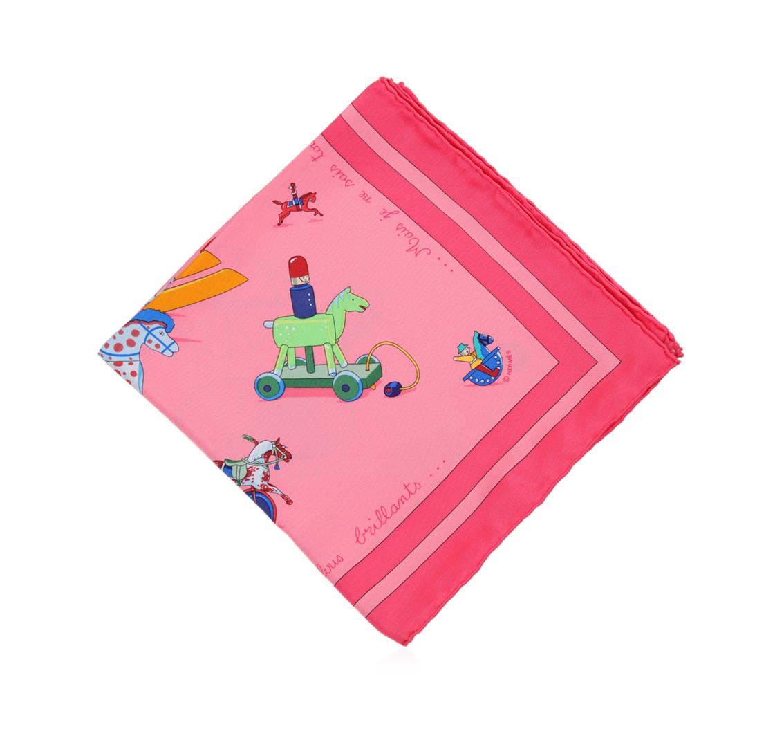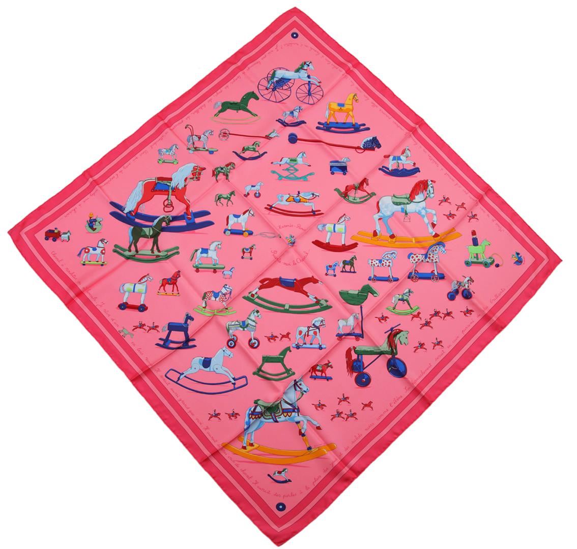 One Hermes silk scarf in good condition, measuring 90cm by 90cm. The scarf features the 'Raconte-Moi le Cheval' design by artist Dimitri Rybaltchenko. The design features images of various rocking horse toys set against a pink background. Comes with an Hermes scarf box.