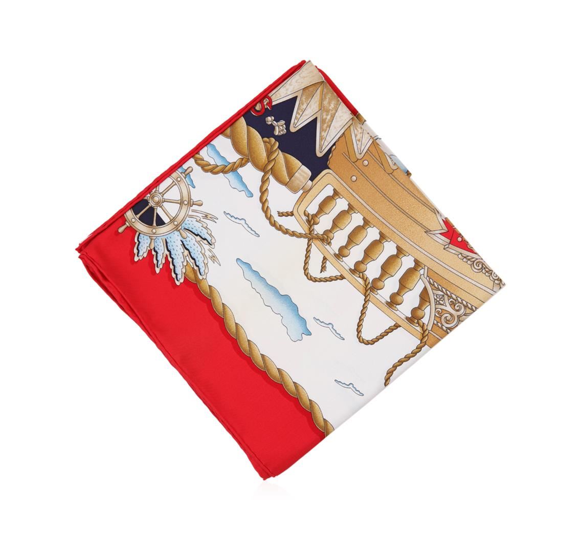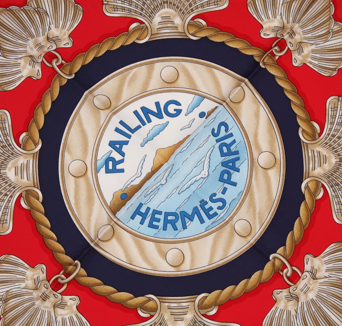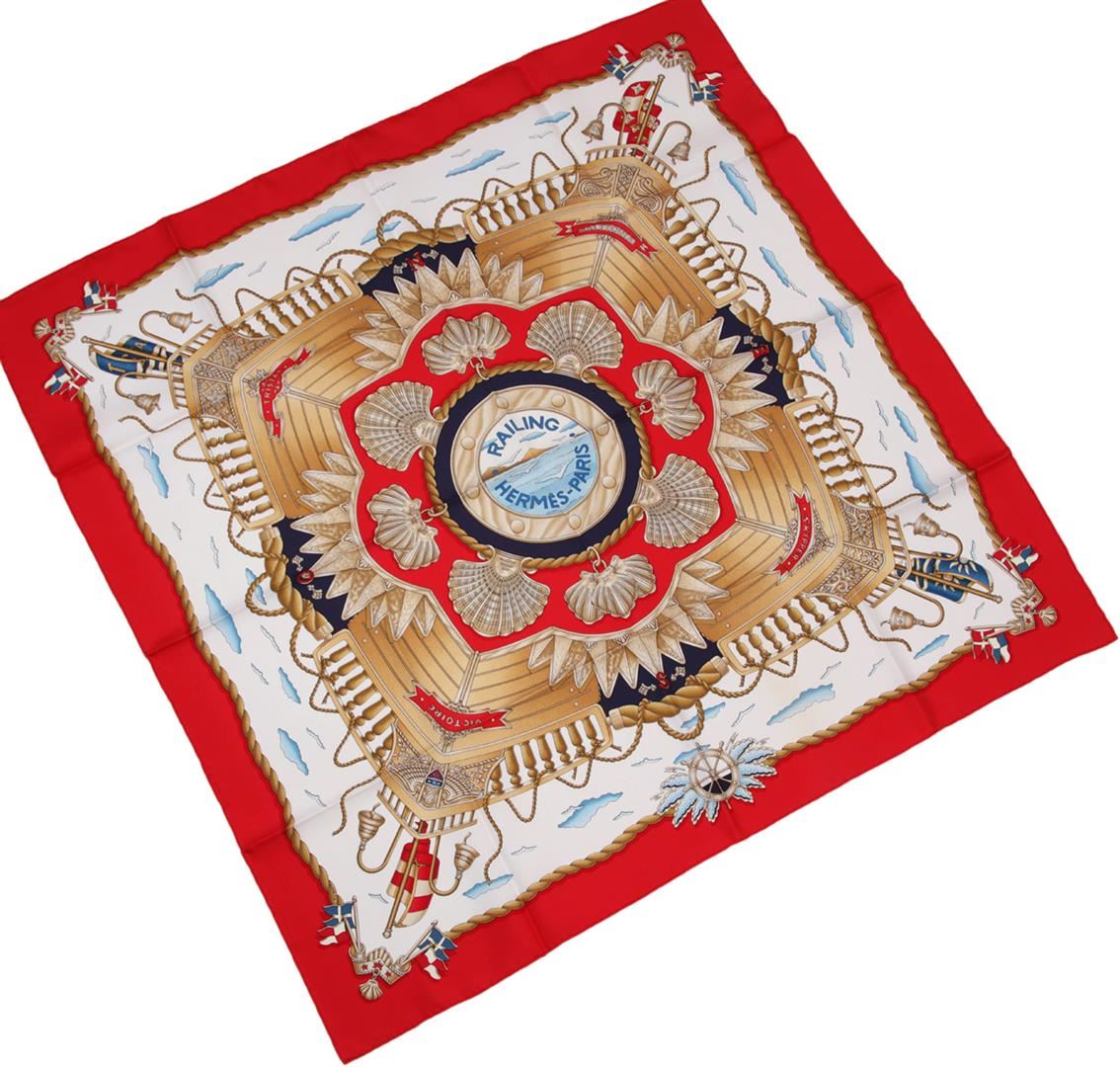 One Hermes silk scarf in good condition, measuring 90cm by 90cm. The scarf features the 'Railing' design by Joachim Metz. The design features the railing of a ship and other nautical motifs in beige with an overall red, white, and blue color scheme. Comes with an Hermes scarf box.