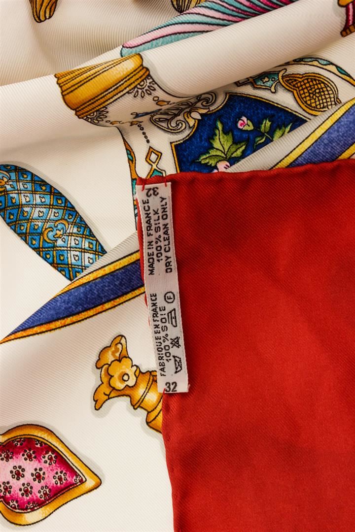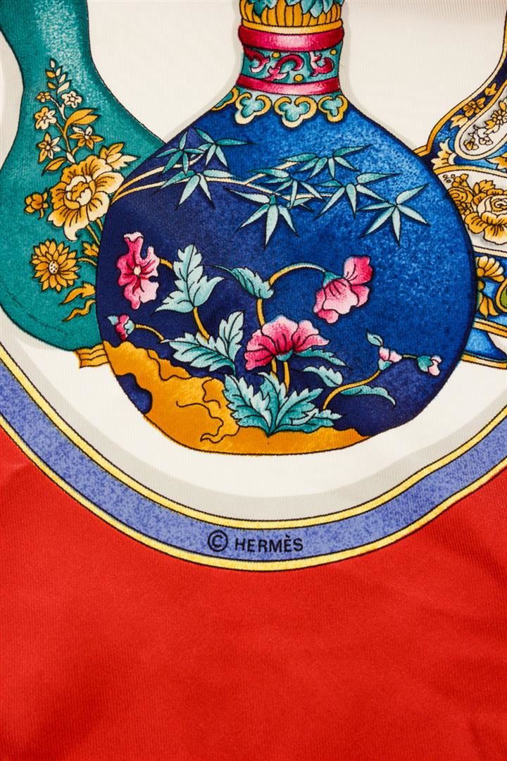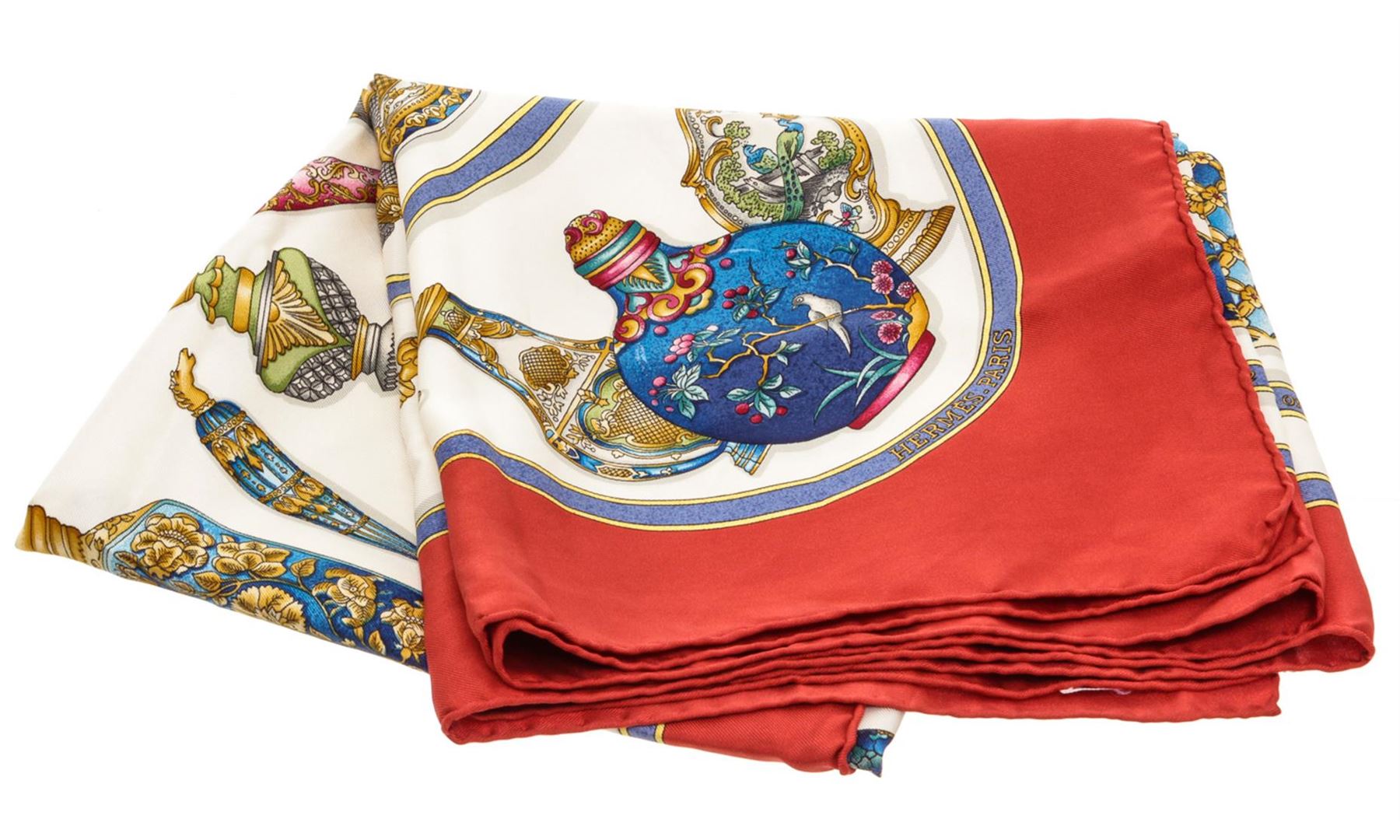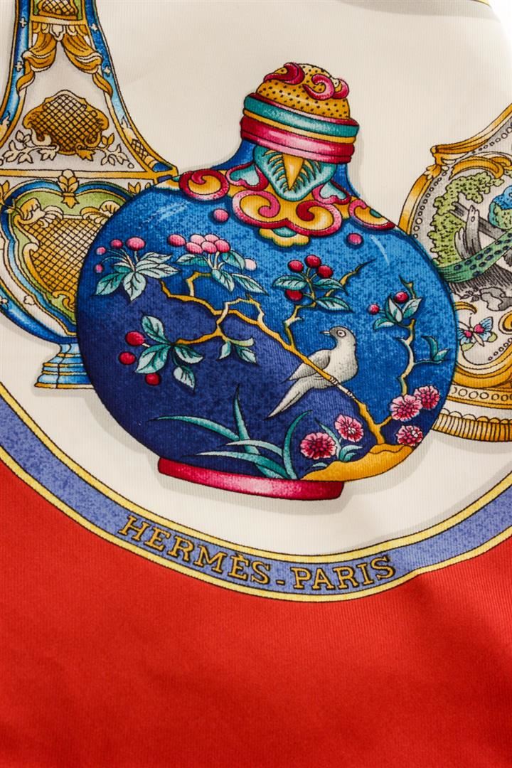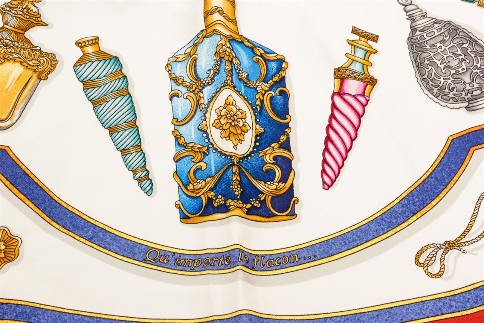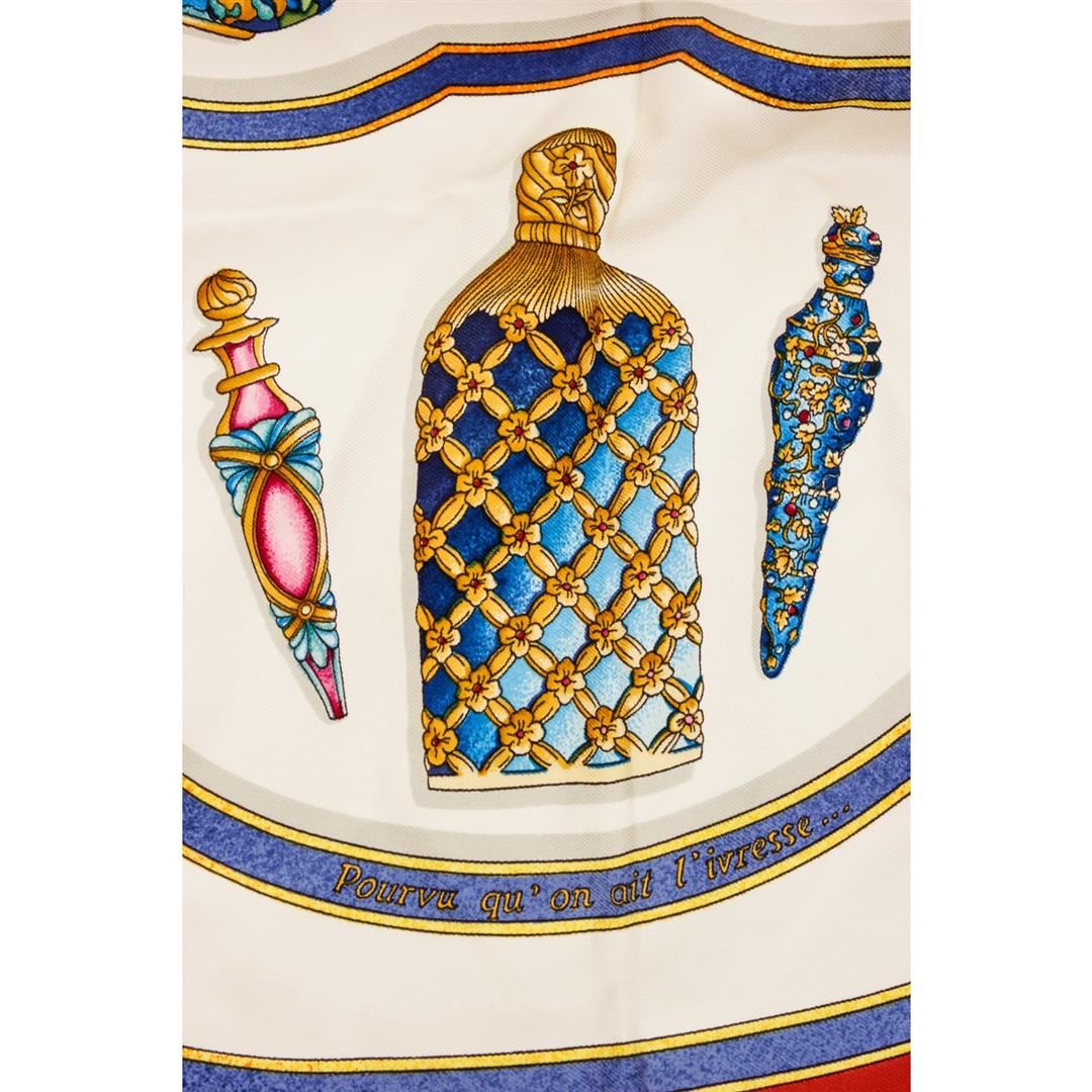 Hermes red blue multicolor Qu'importe le Flacon Catherine Baschet Silk Scarf 90, hand rolled edges.