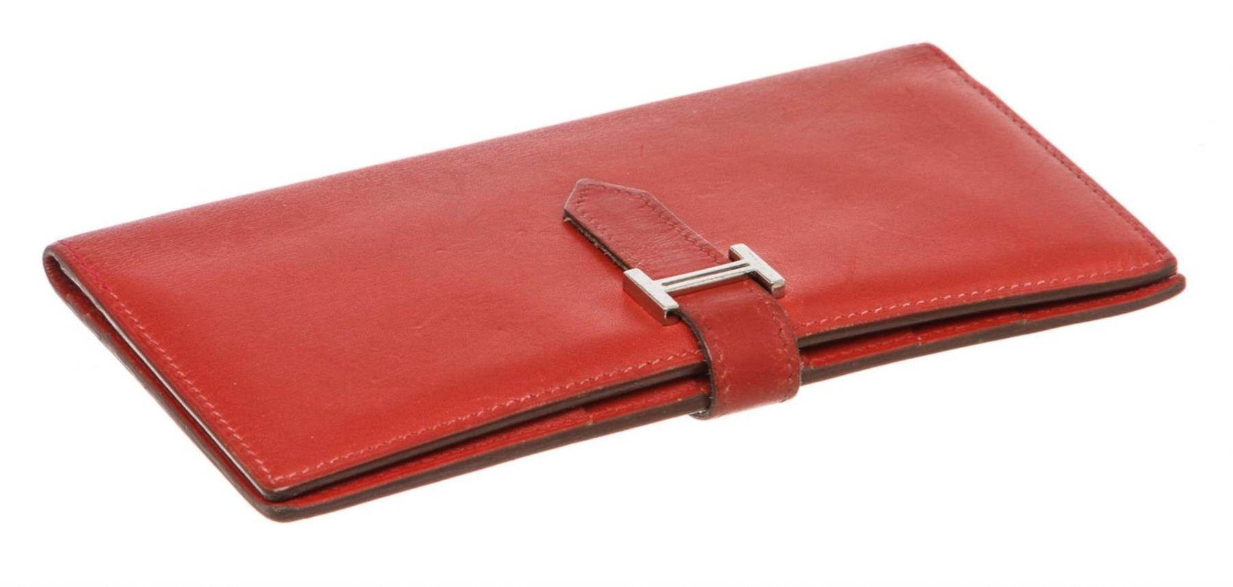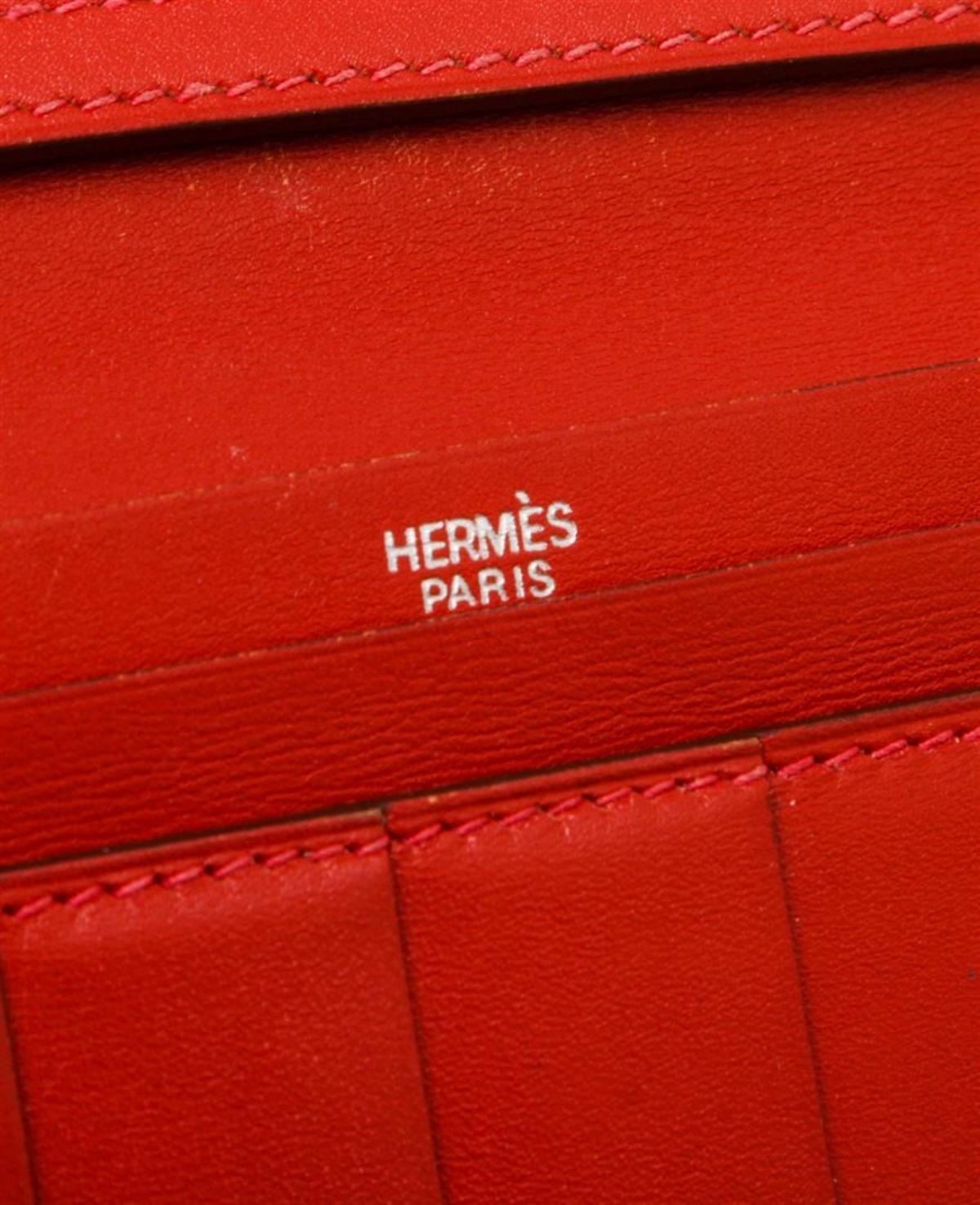 One Hermes Red Box Leather Bearn Wallet. Red box leather Hermès Bearn wallet with palladium-plated hardware, tonal leather lining, single zip pocket, four bill compartments, five card slots and pull-through closure at front.