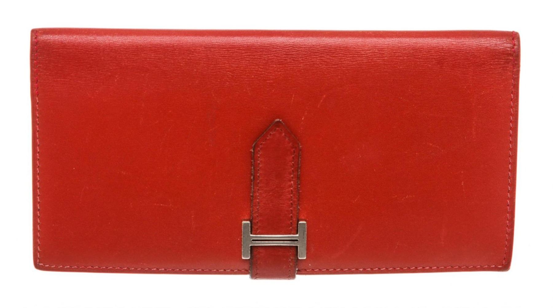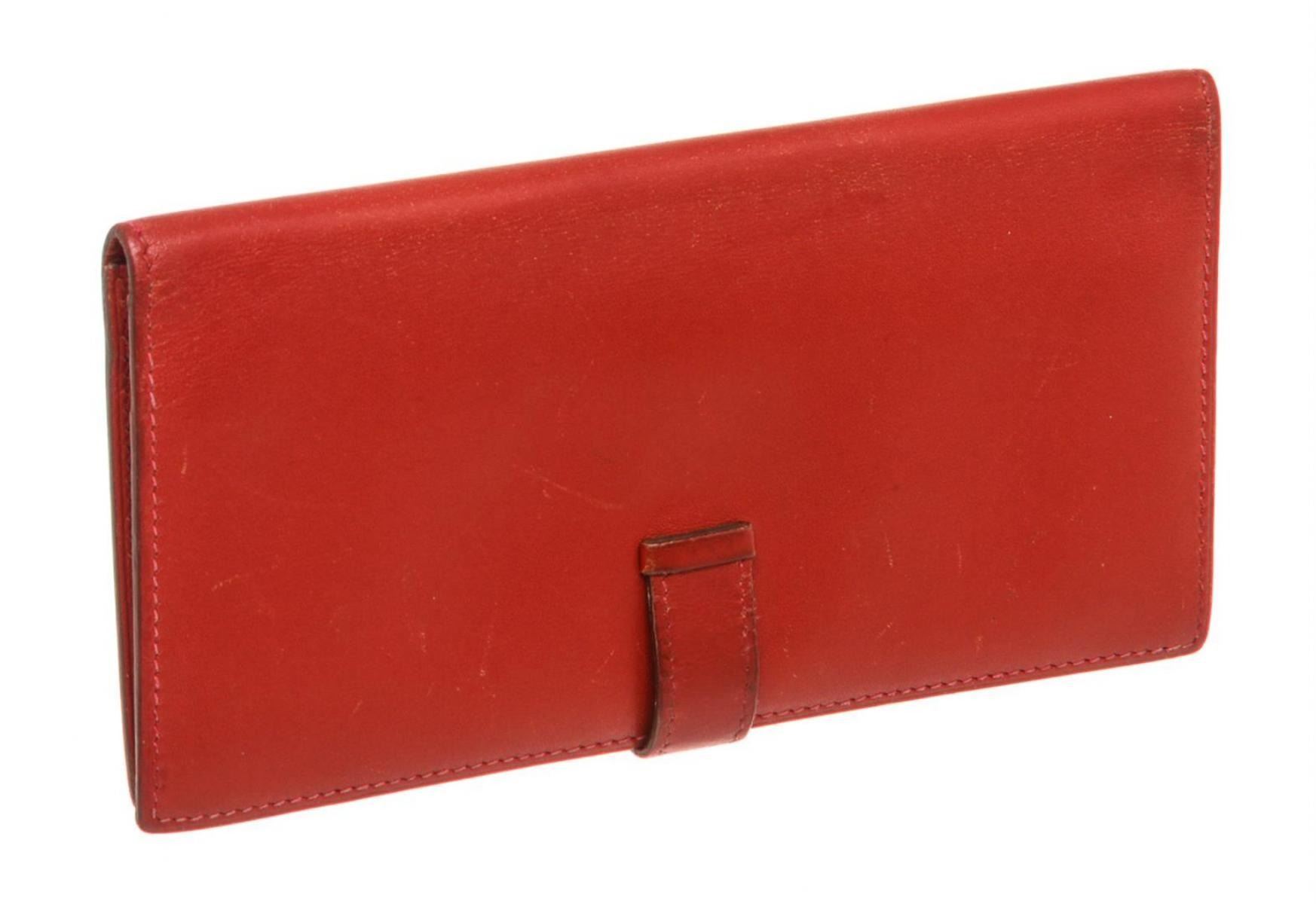 One Hermes Red Box Leather Bearn Wallet. Red box leather Hermès Bearn wallet with palladium-plated hardware, tonal leather lining, single zip pocket, four bill compartments, five card slots and pull-through closure at front.