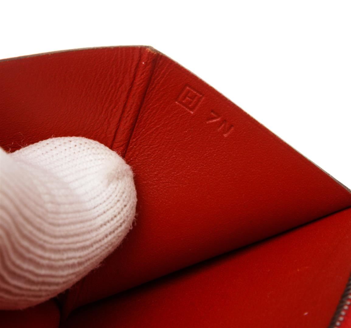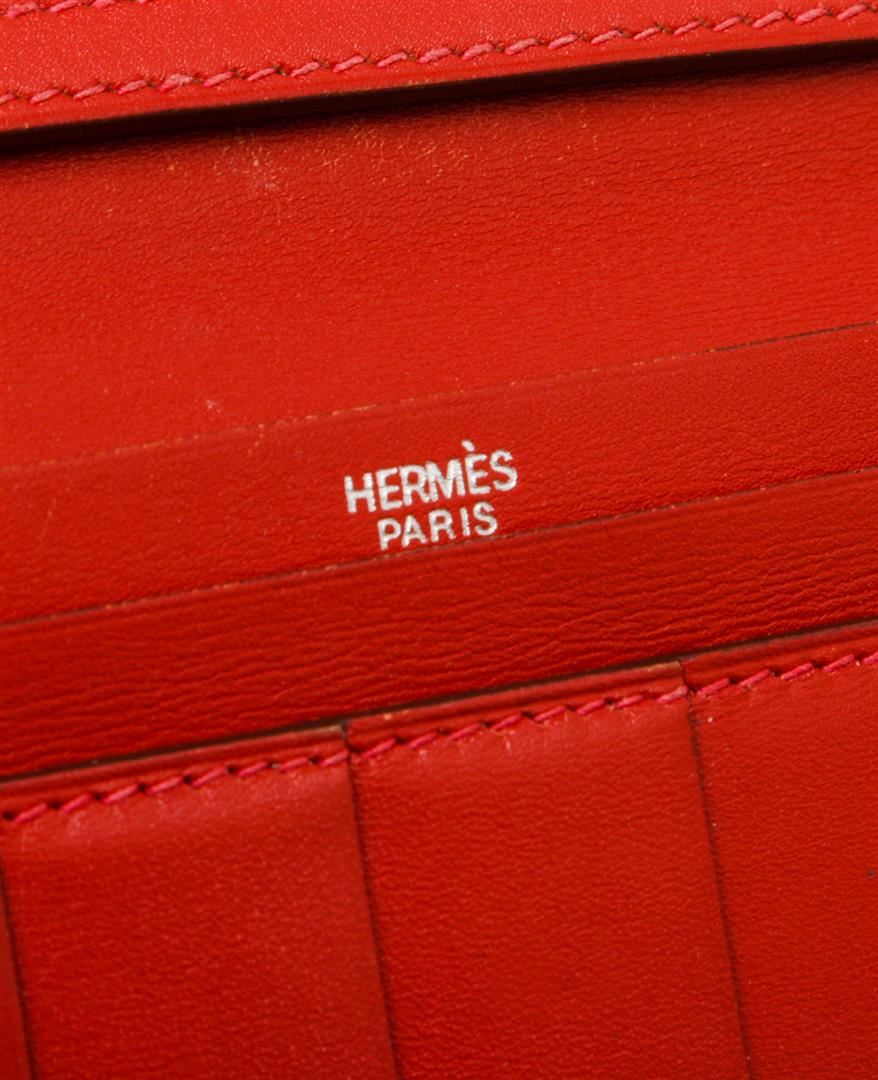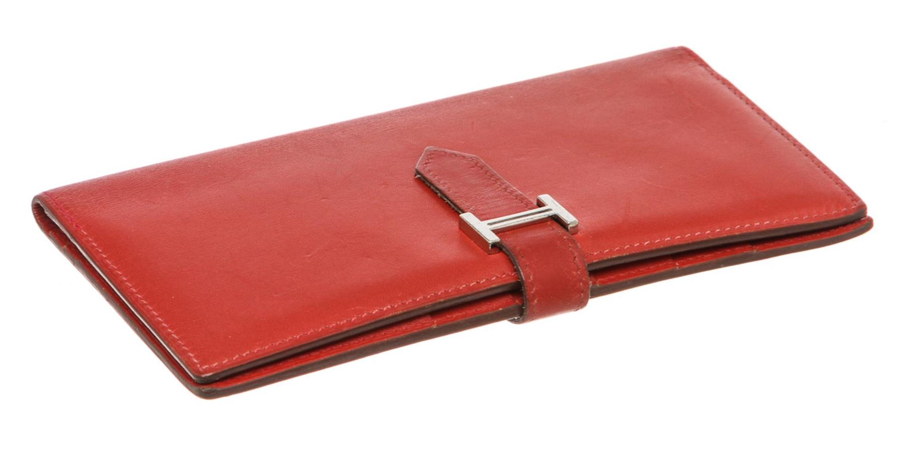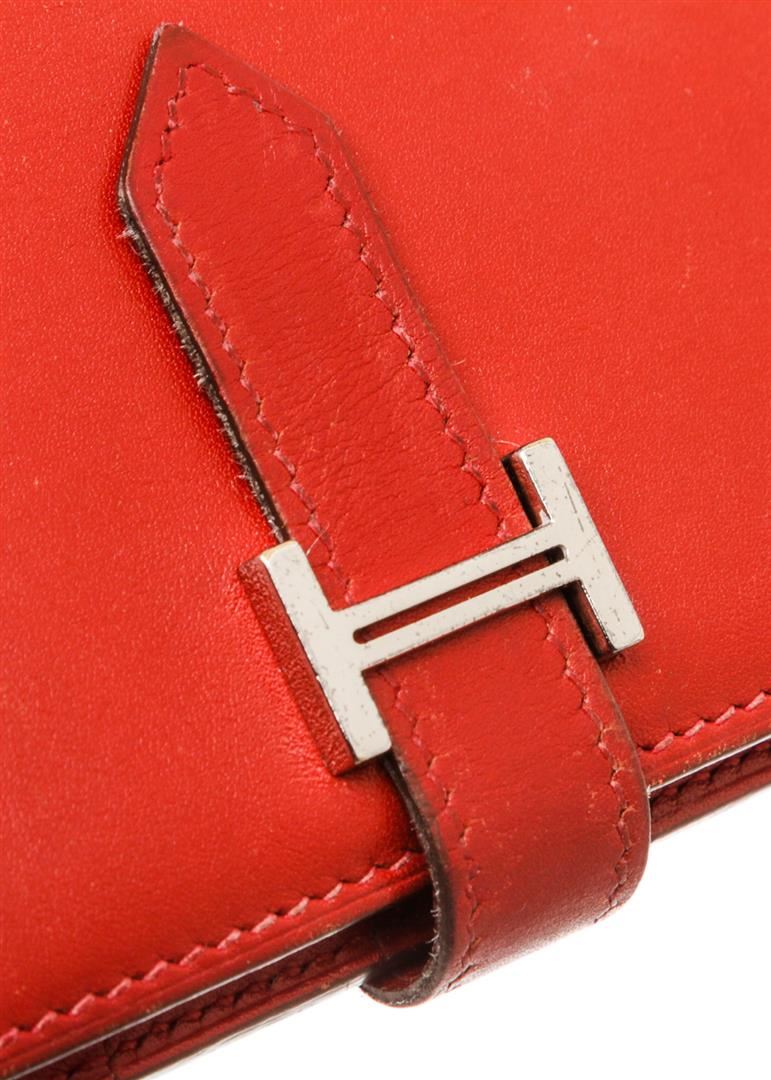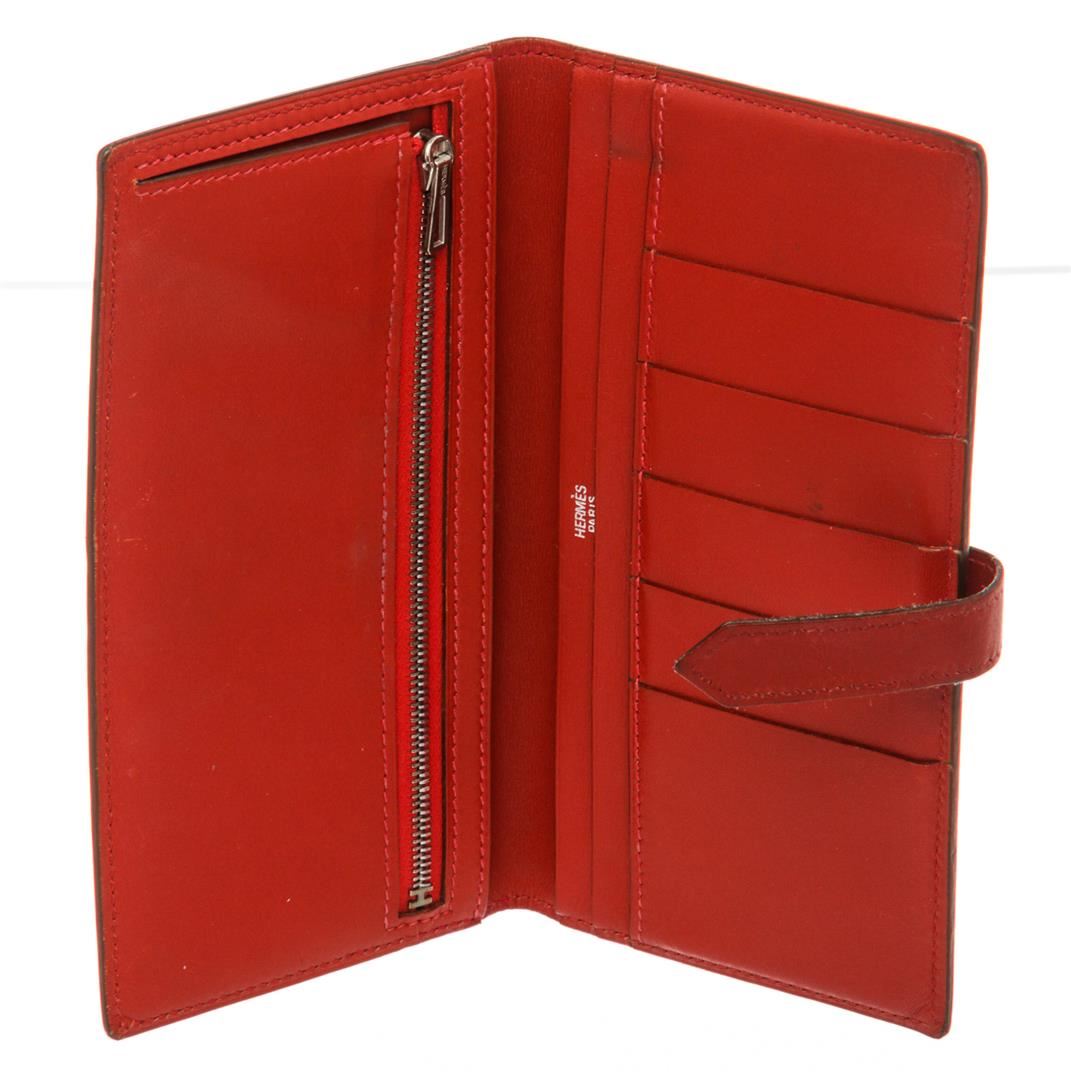 One Hermes Red Box Leather Bearn Wallet. Red box leather Hermès Bearn wallet with palladium-plated hardware, tonal leather lining, single zip pocket, four bill compartments, five card slots and pull-through closure at front.