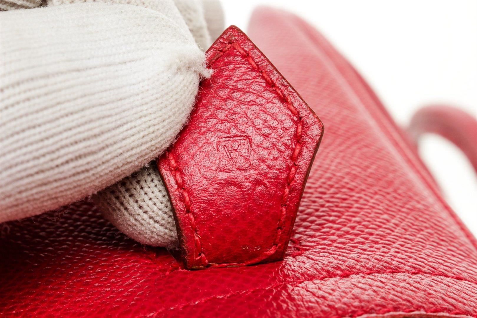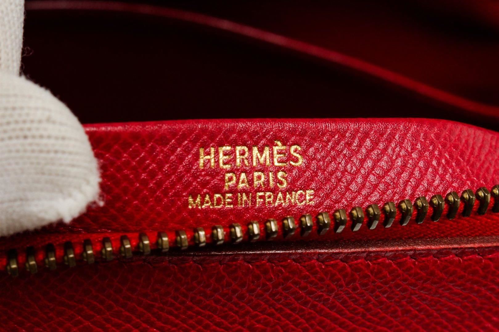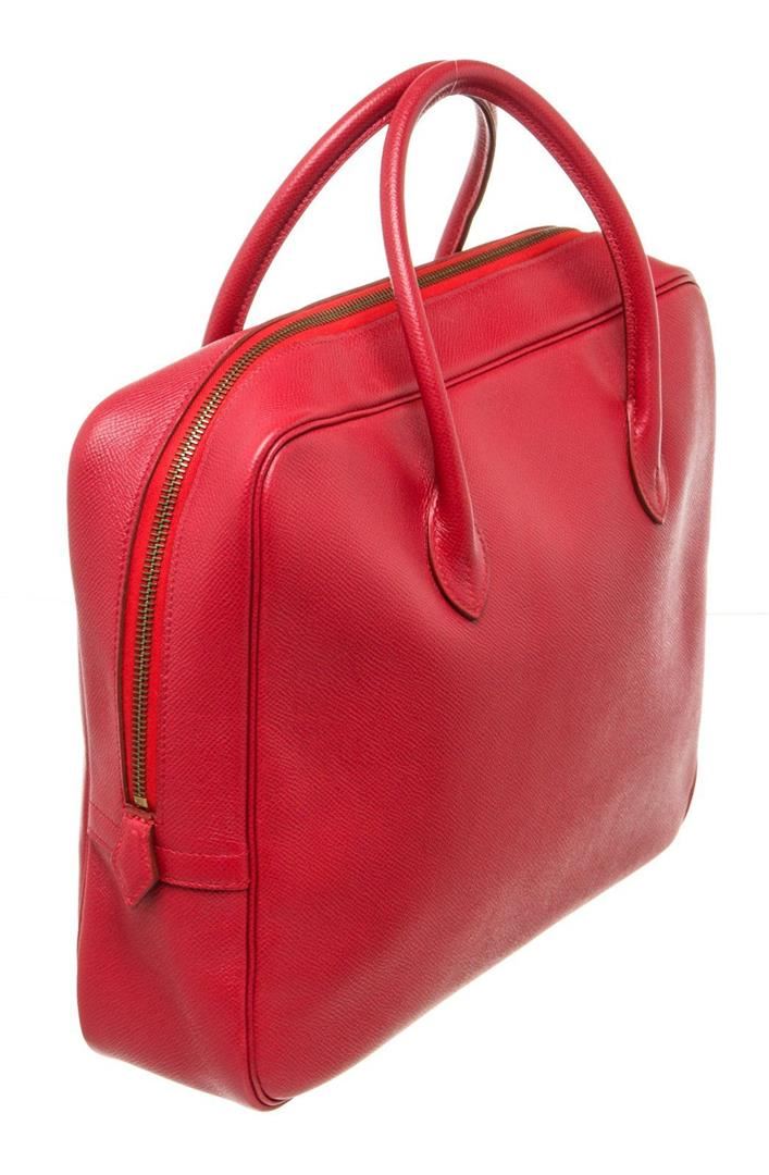 Hermes Red Leather Eiffel Briefcase Bag with leather, gold-tone hardware, trim leather, interior slip pocket, dual top handle and zipper closure.