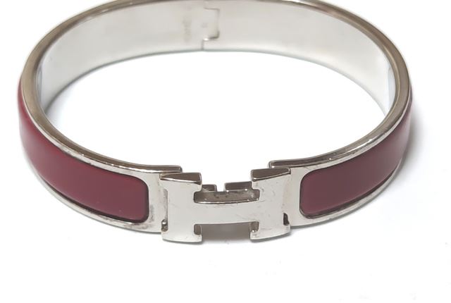 Red metal Hermes Clic Clac bangle with Palladium hardware and CC turn-lock closure.
