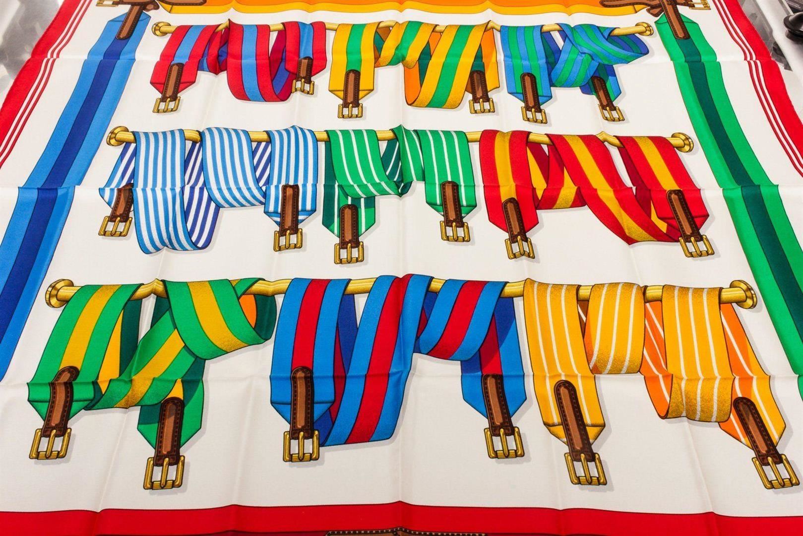 Hermes Red Multicolor Silk Scarf with gold-tone hardware.
