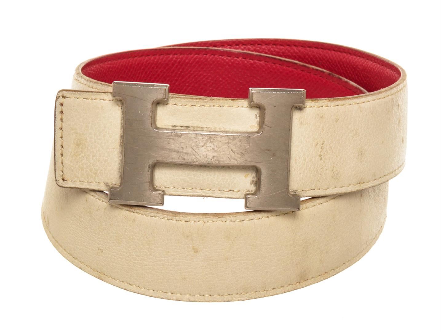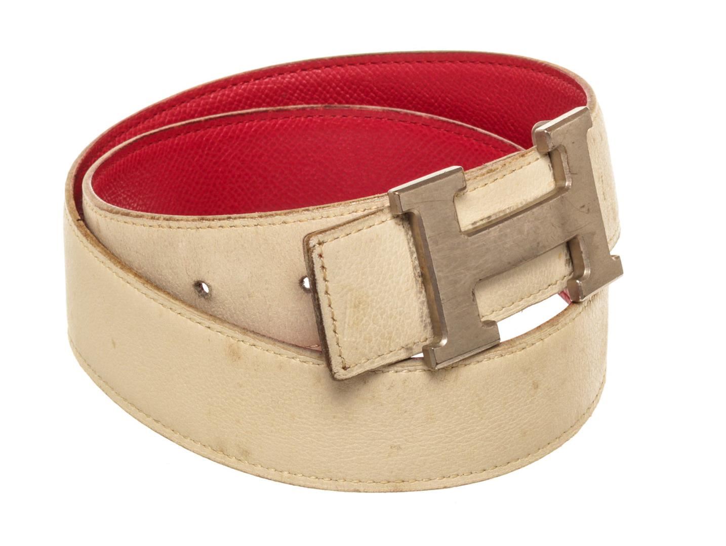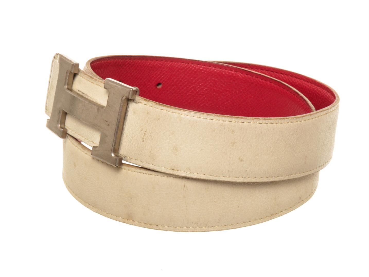 Hermes Red White Leather H Belt with tonal stitching and silver-plated 'H' buckle featuring peg-in-hole closure. Extra punch hole in belt