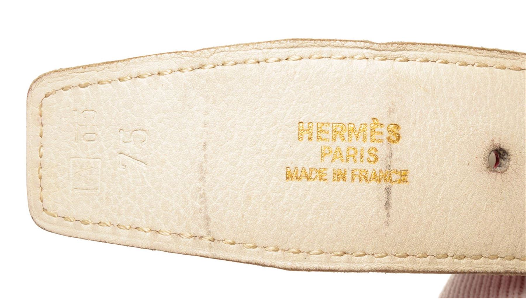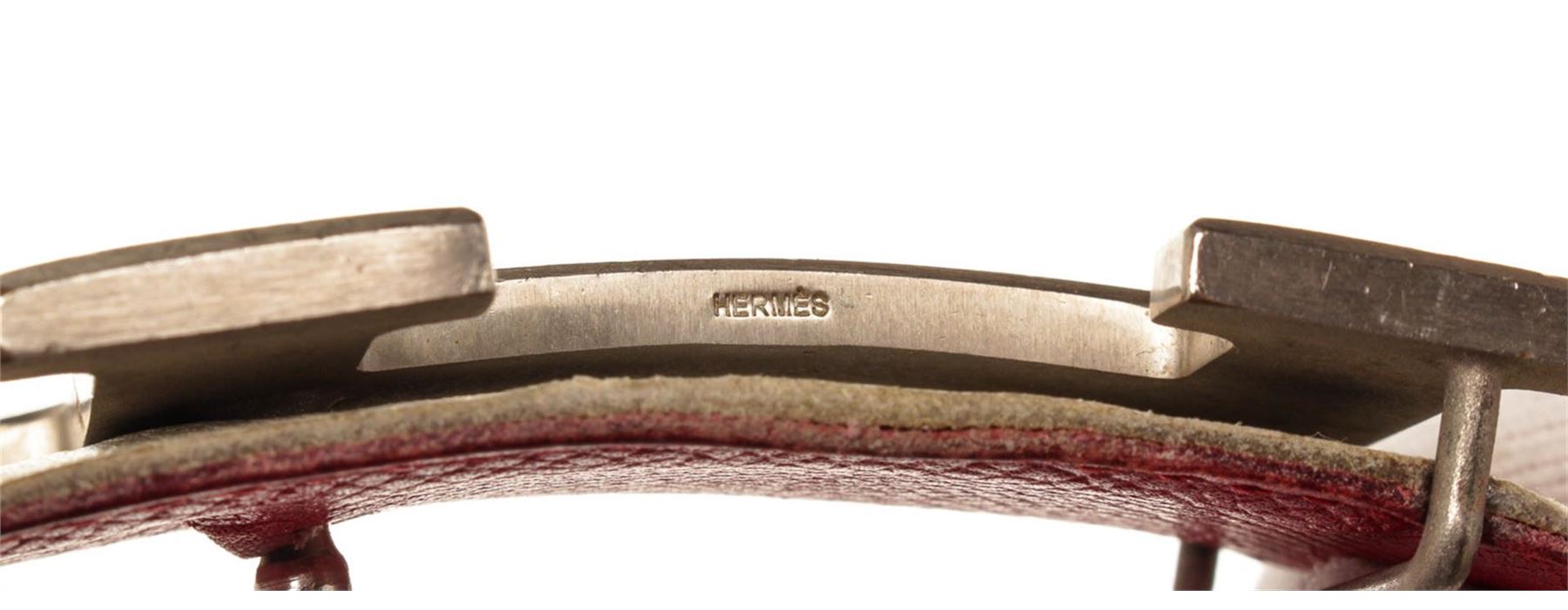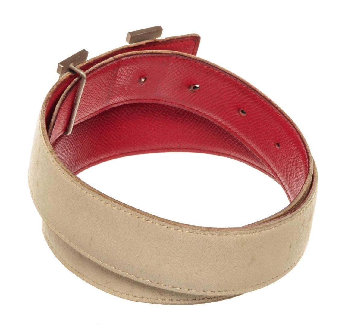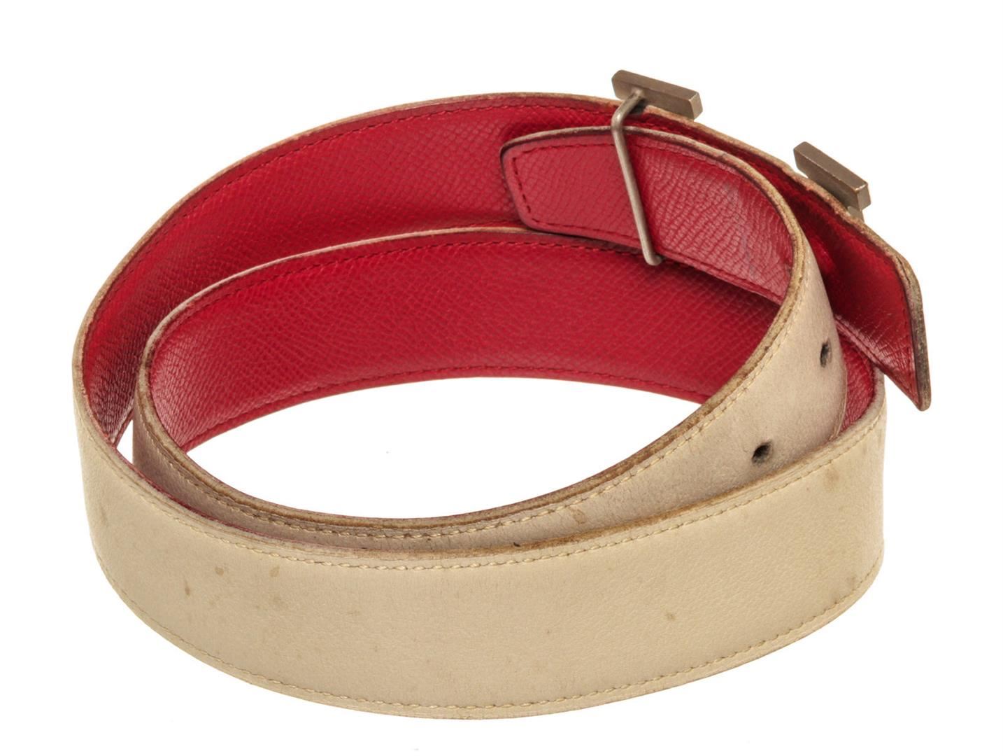 Hermes Red White Leather H Belt with tonal stitching and silver-plated 'H' buckle featuring peg-in-hole closure. Extra punch hole in belt