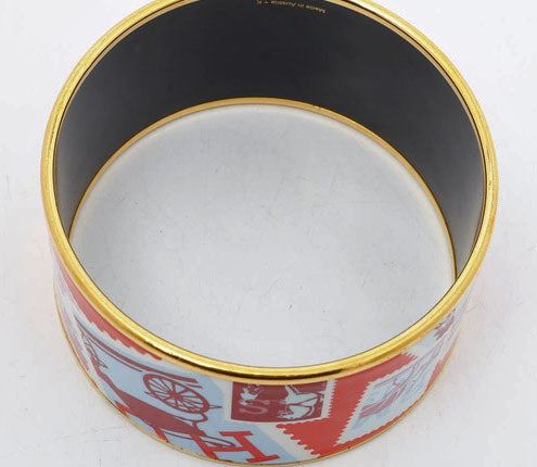 Hermes Paris Stamp Collection Enamel Logo bangle bracelet is wide and beautifully decorated with a colorfully red multicolor enameled graphic design of postal stamps and Hermes horses with a gold-tone rim.