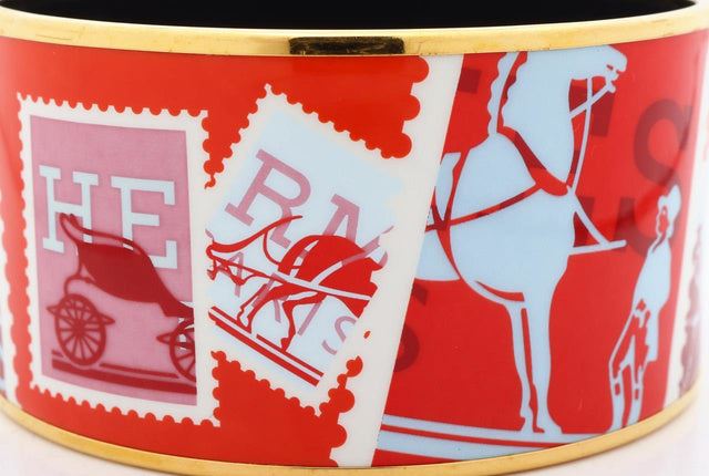 Hermes Paris Stamp Collection Enamel Logo bangle bracelet is wide and beautifully decorated with a colorfully red multicolor enameled graphic design of postal stamps and Hermes horses with a gold-tone rim.