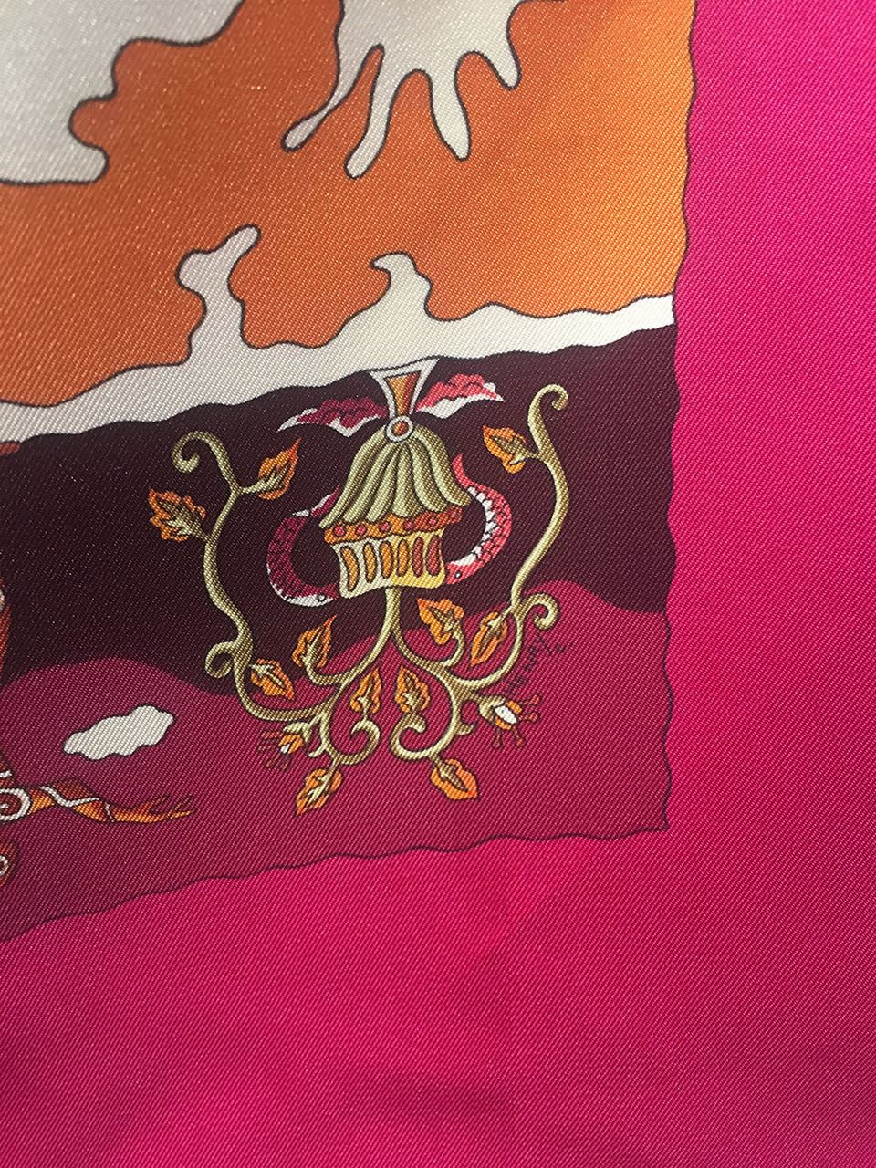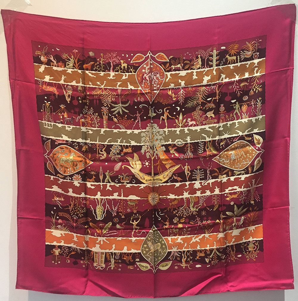STUNNING Hermes Rives Fertiles Silk Scarf in Magenta in excellent condition. Original silk screen design by Christine Henry c2005 features an arrangement of various real and mythological floral and fauna found along the fertile river bank of the Egyptian Nile in rows separated by tan, brown, and orange stripes. Magenta border surrounds entire design. 100% silk, hand rolled hem, made in France, signed by artist, tag attached. No stains, smells or fabric pulls. Measurements: 35"x35" scarf box included. Â Â#Bags1222