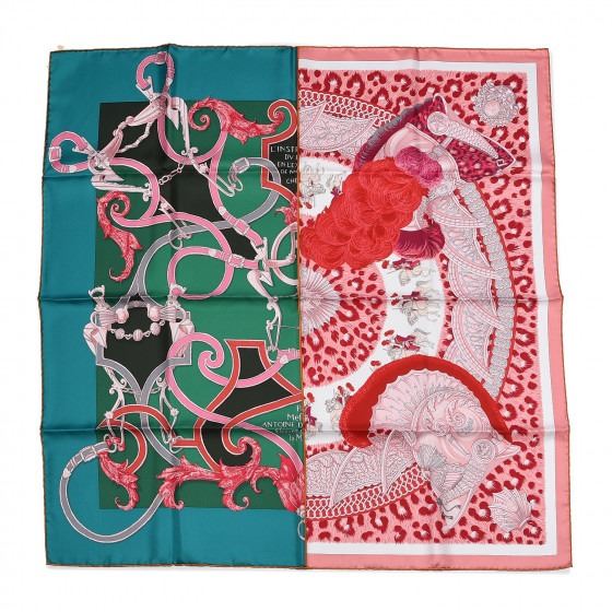Vert Rose Blanc  scarf is 100% silk and the design is in a traditionally baroque decorative elaboration of a horse bridles on a multicolor background. The underside features an array of helmets and tones of red.