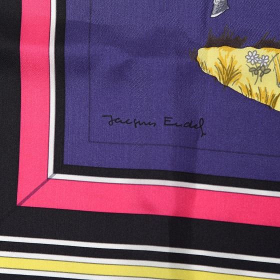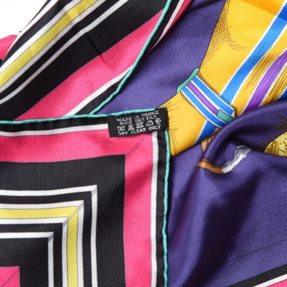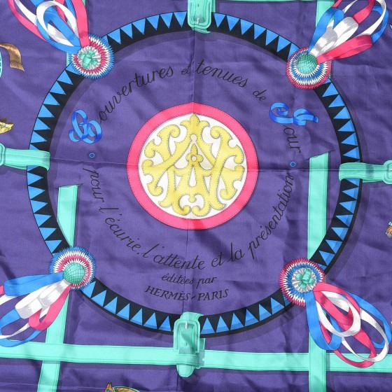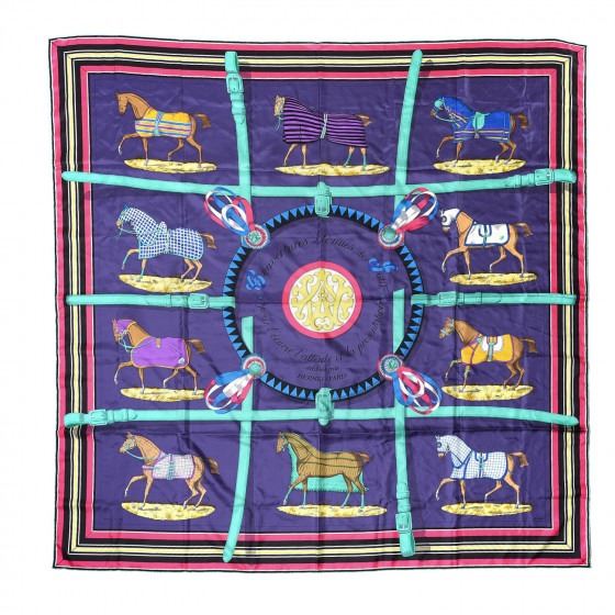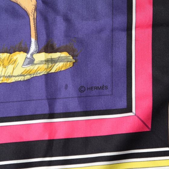 Hermes 100% silk scarf has a beautiful equestrian motif on a purple background with a dark pink and black border.