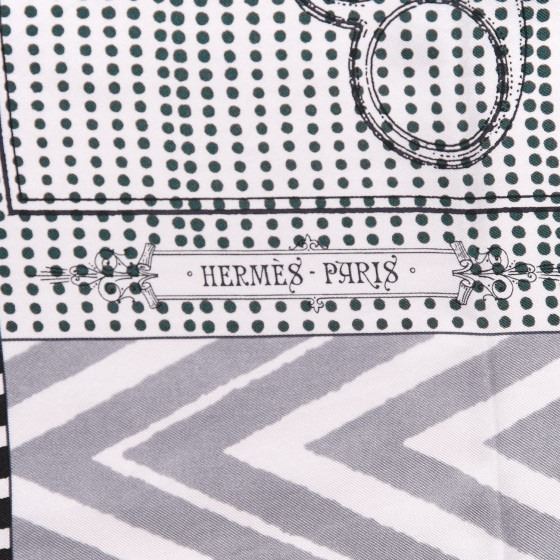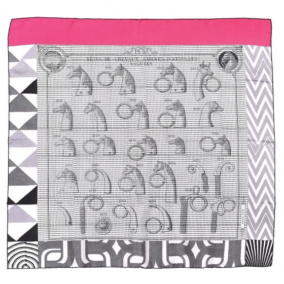 lanc Rose Indien Gris scarf is crafted of 100% silk and features an images of manufactory parts with an overlay of chevron strips, dots and semi-circles in multicolor.