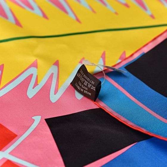 Rose Bleu Vert scarf is made of 100% silk and has a beautiful block color motif on a pink background with a dark pink border.