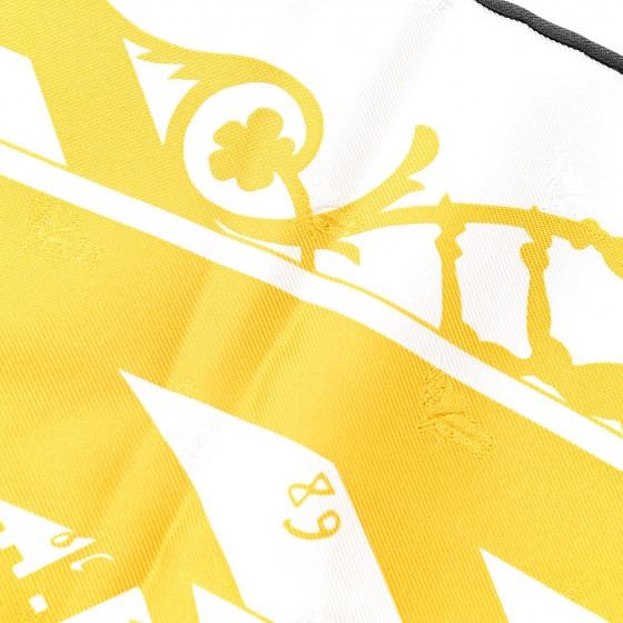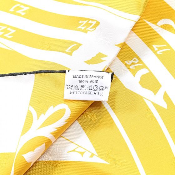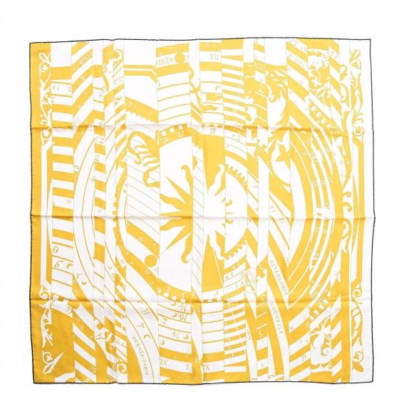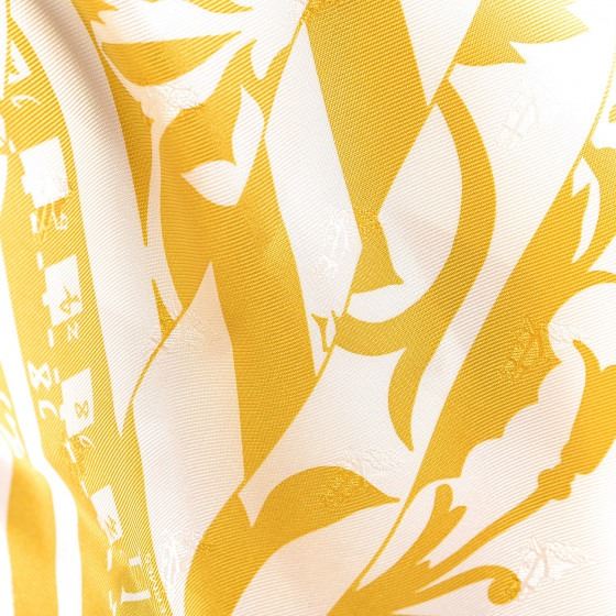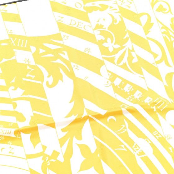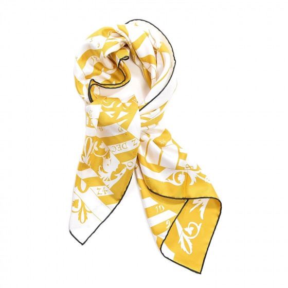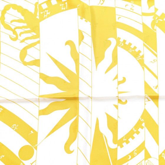 100% silk scarf has brightly colored patterns in yellow featuring a zodiac image with bold detailing.