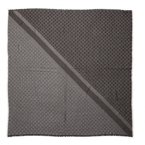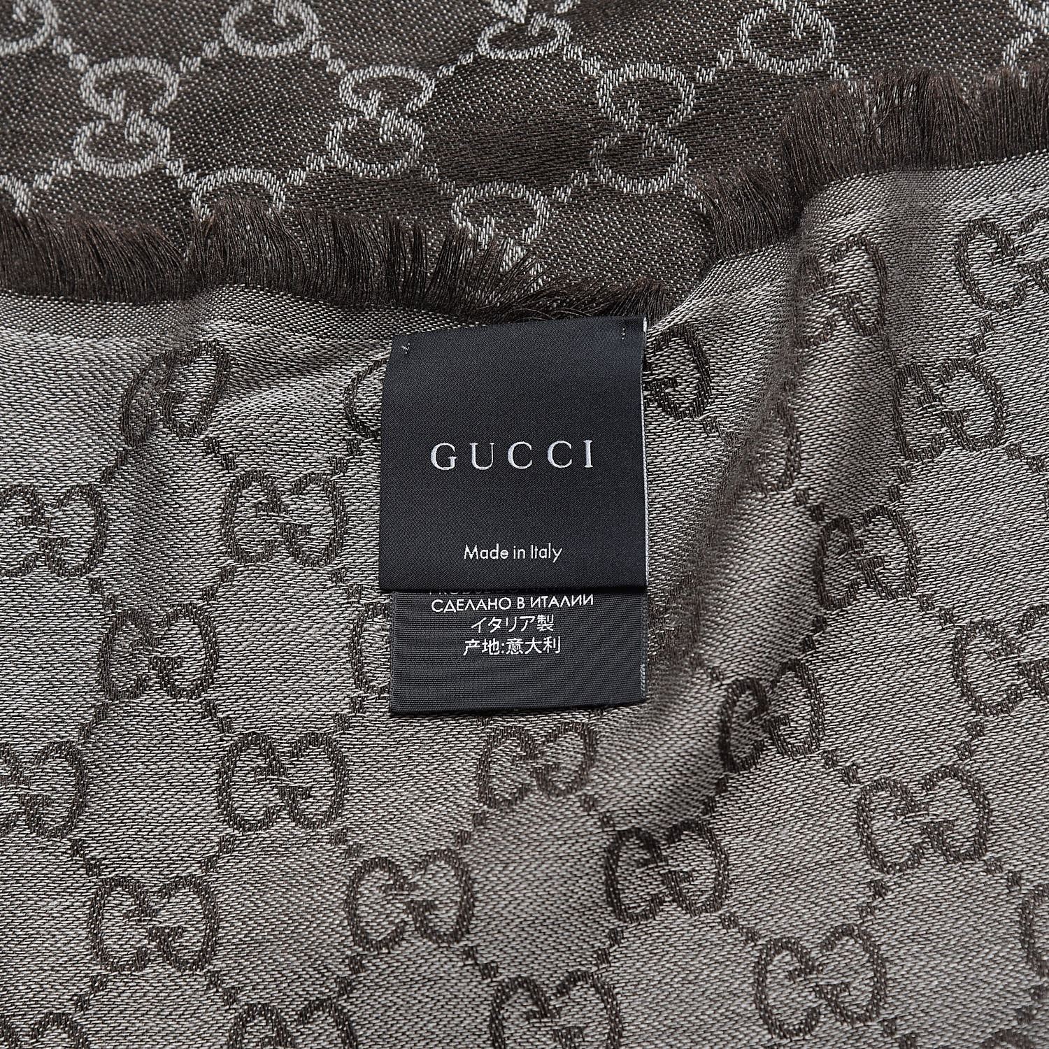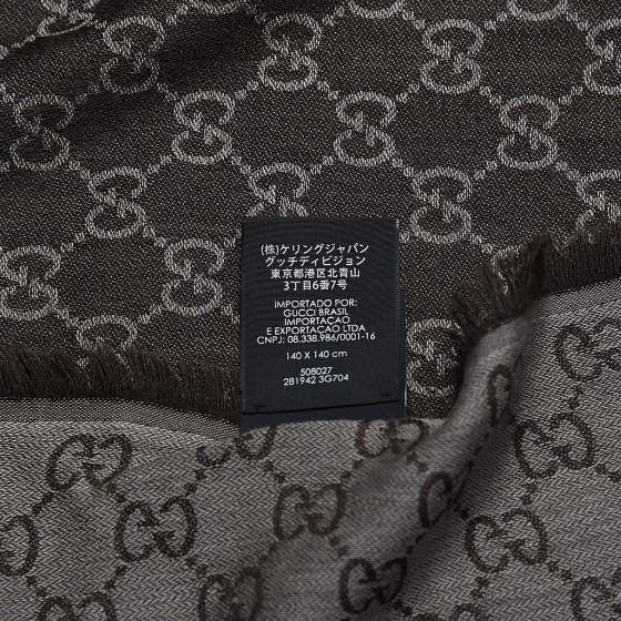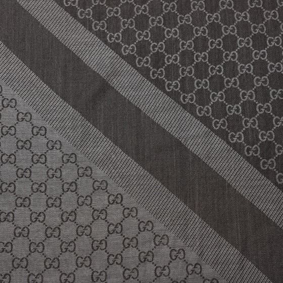 This sophisticated scarf is finely crafted of 80% wool and 20% silk, featuring a tonal Gucci GG monogram print with fringed edges.