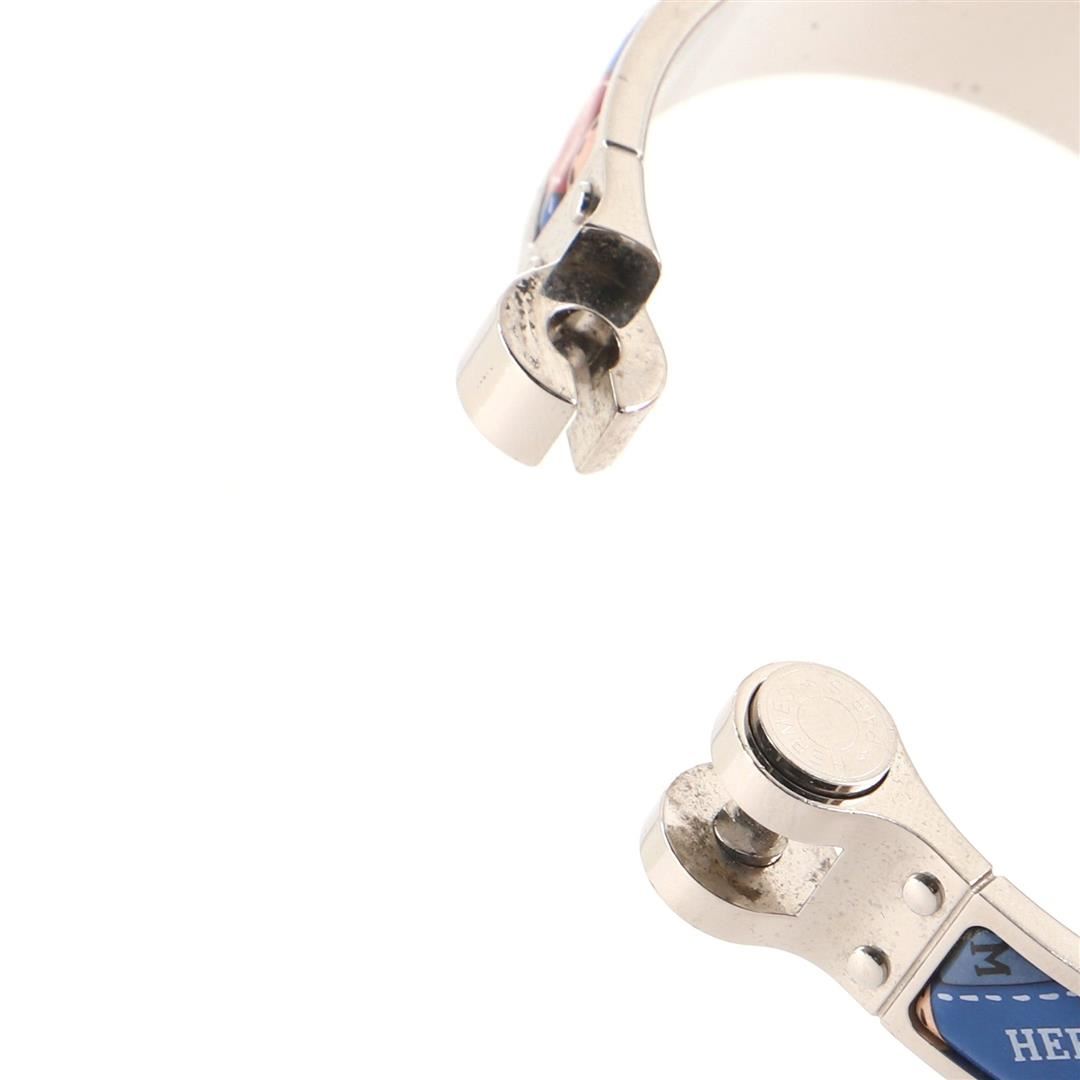 Palladium-plated Hermès hinged bracelet featuring printed enamel inlays and push clasp closure.