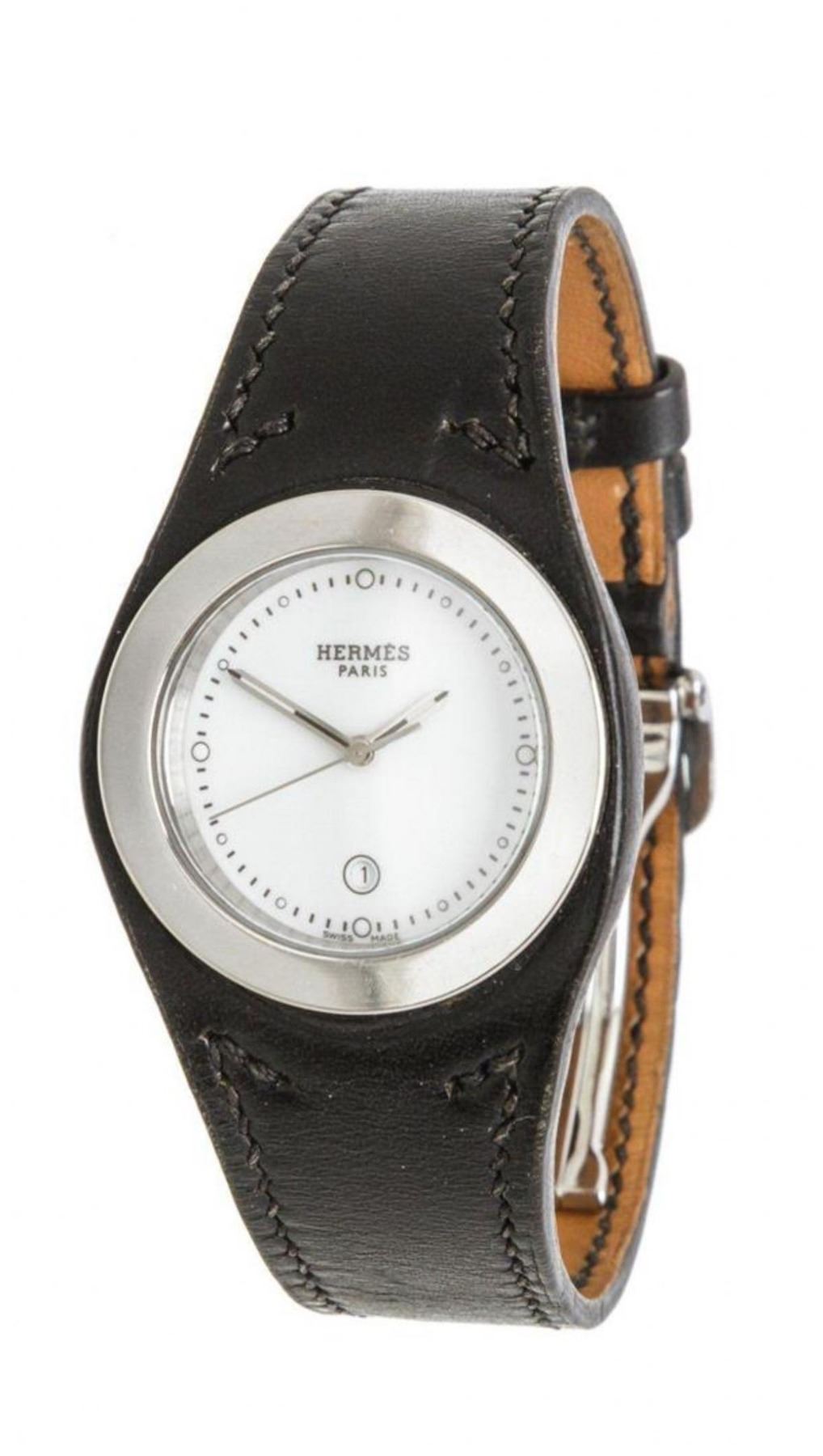 Stainless steel 30mm Hermès Harnais watch featuring a quartz movement, smooth bezel, white dial and black leather strap with tang buckle. The fit of this watch can be made larger or smaller by adjusting the buckle. Measurements: Length: 1 in / 3 cm Width: 1 in / 3 cm 1 in / 3 cmCONDITION: Pre-Owned Good overall, please see photographs for detail.