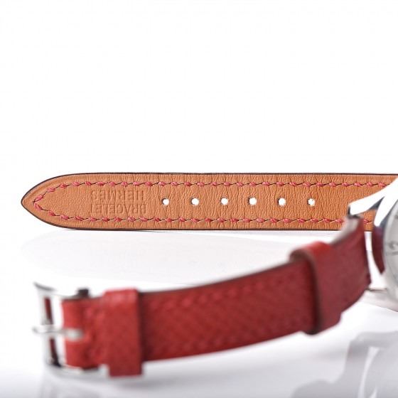 Rouge Casaque watch is crafted of a stainless steel and features a silver dial with black Arabic numeral hour markers, sapphire crystal, quartz movement, and a red epsom leather strap.