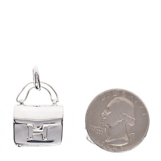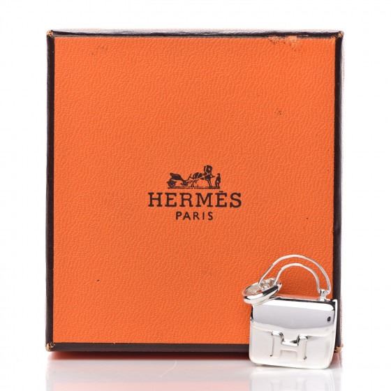 Crafted of sterling silver and features a pendant in the shape of a miniature Kelly handbag.