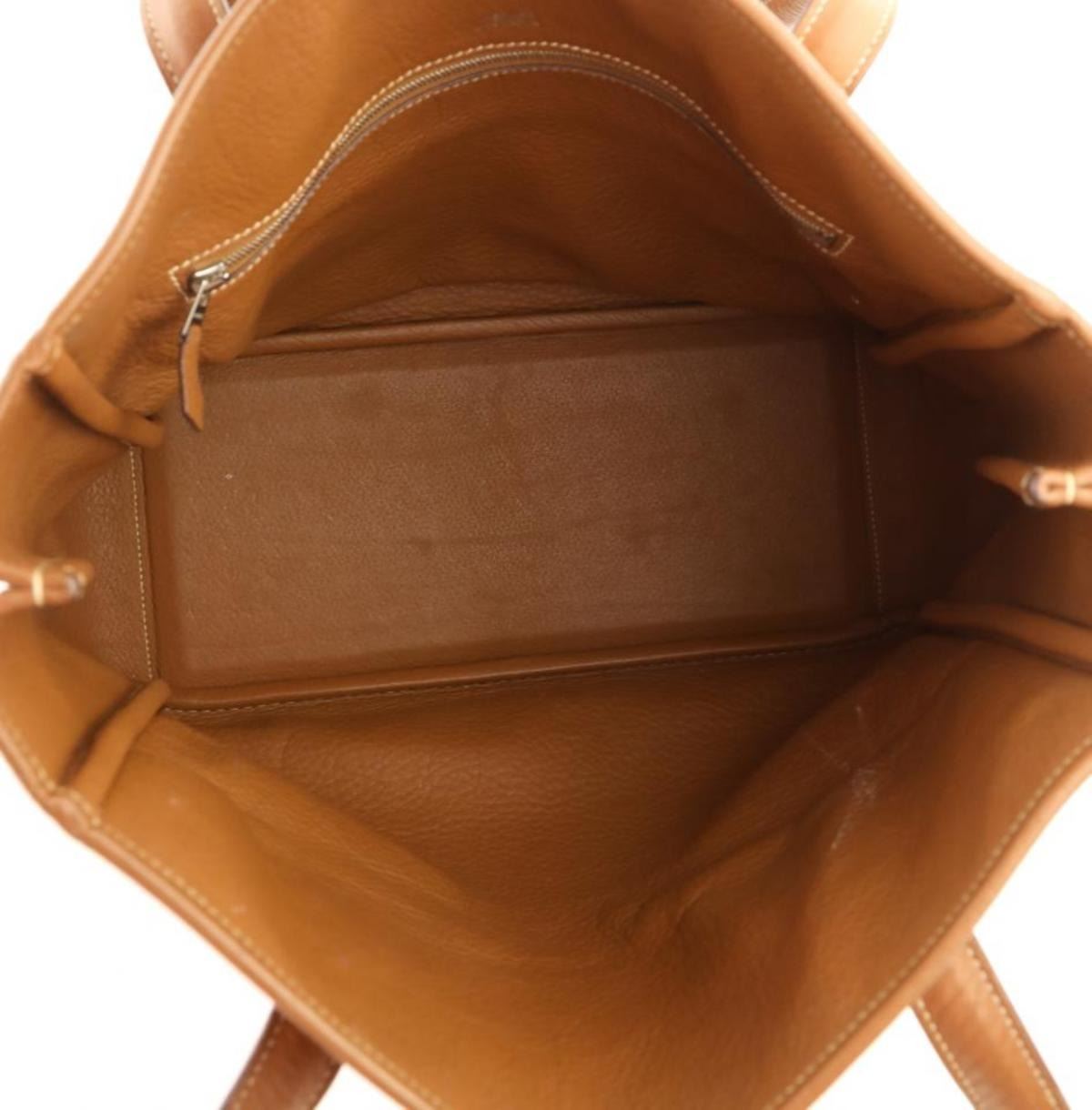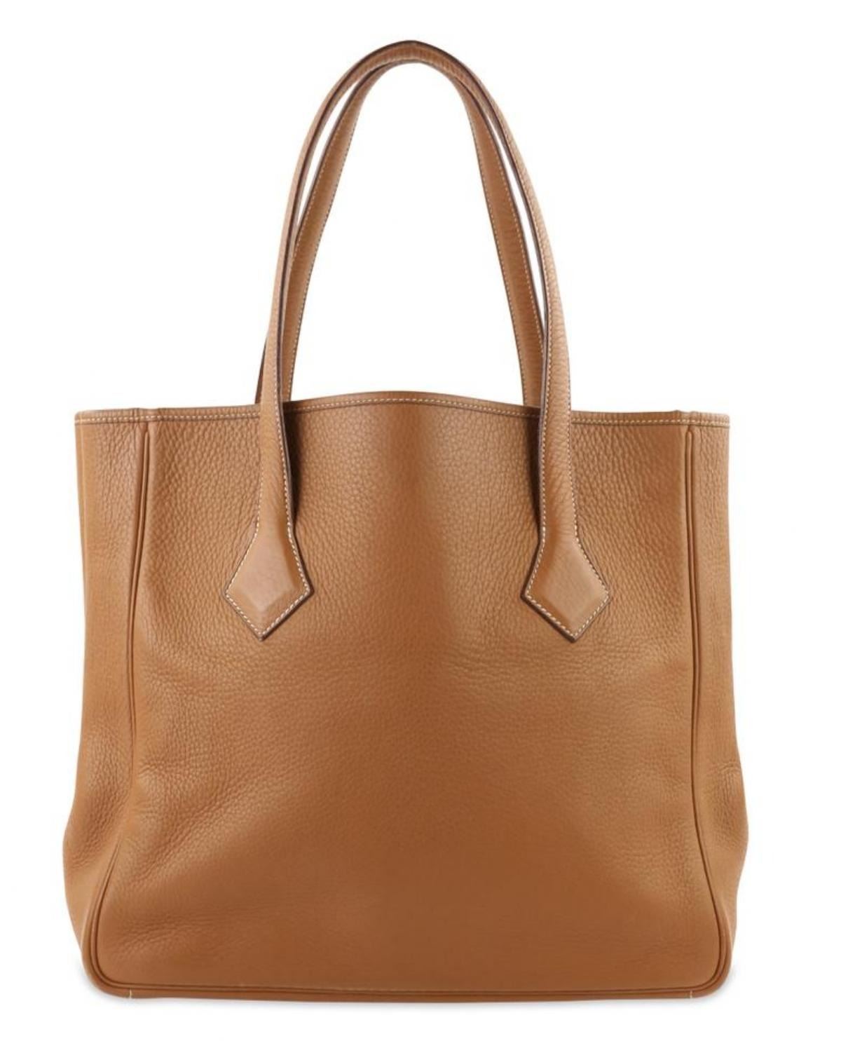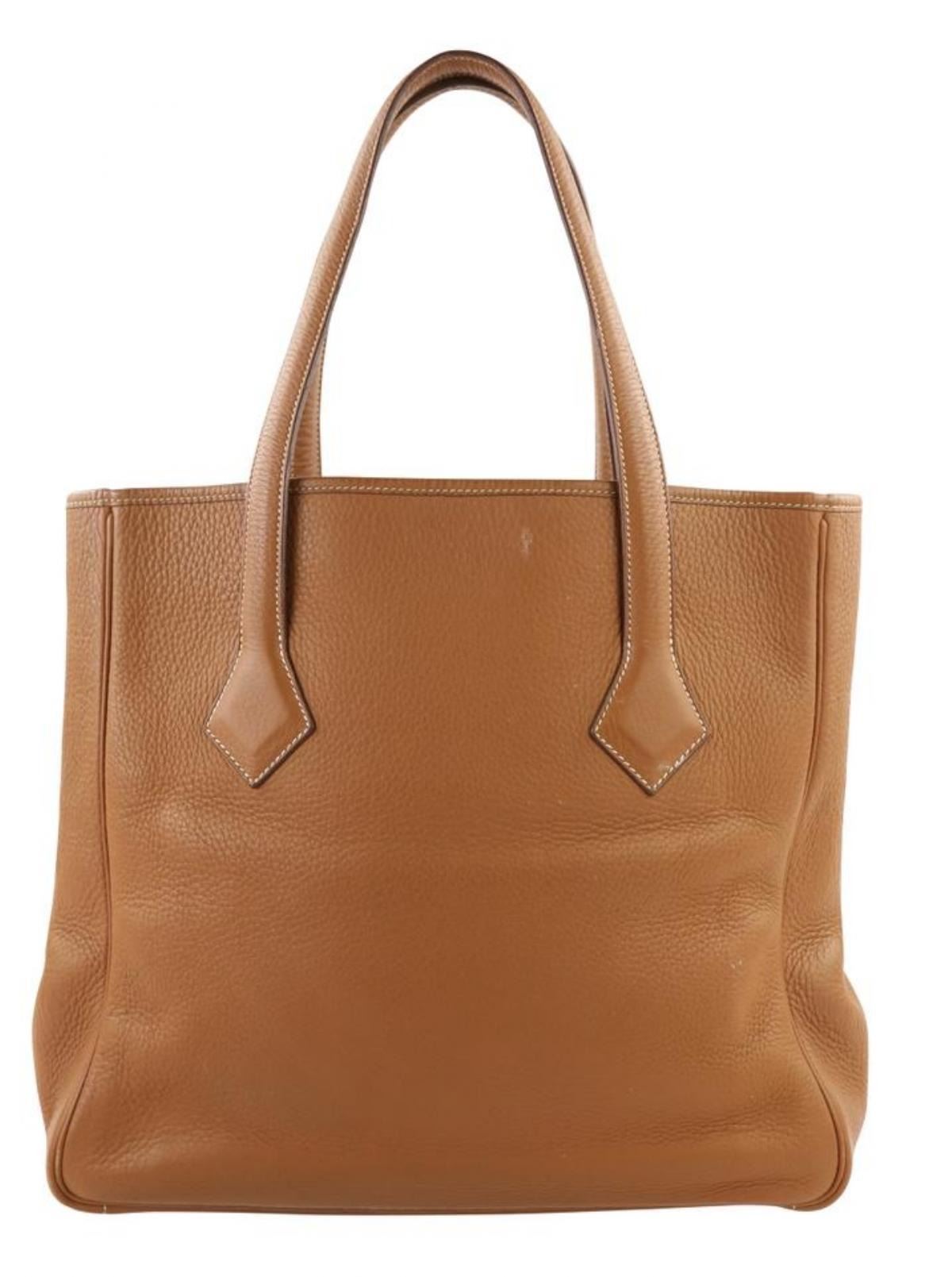 One Hermes Victoria Cabas Clemence 32 Brown Leather Shoulder Bag. Hermes Victoria Cabas Clemence Handle drop . " Can be worn over a single shoulder or carried at the elbow at the widest point ." Clemence is a matte grained leather Hermes color: Etrusque - which is very similar to the Hermes Gold (a light brown) color but is a few shades darker White tonal stitching Bag has a softly structured shape - cannot stand on its own Open top Palladium hardware with an interior zipper and protective feet at the base of the bag interior zip pocket Made in France