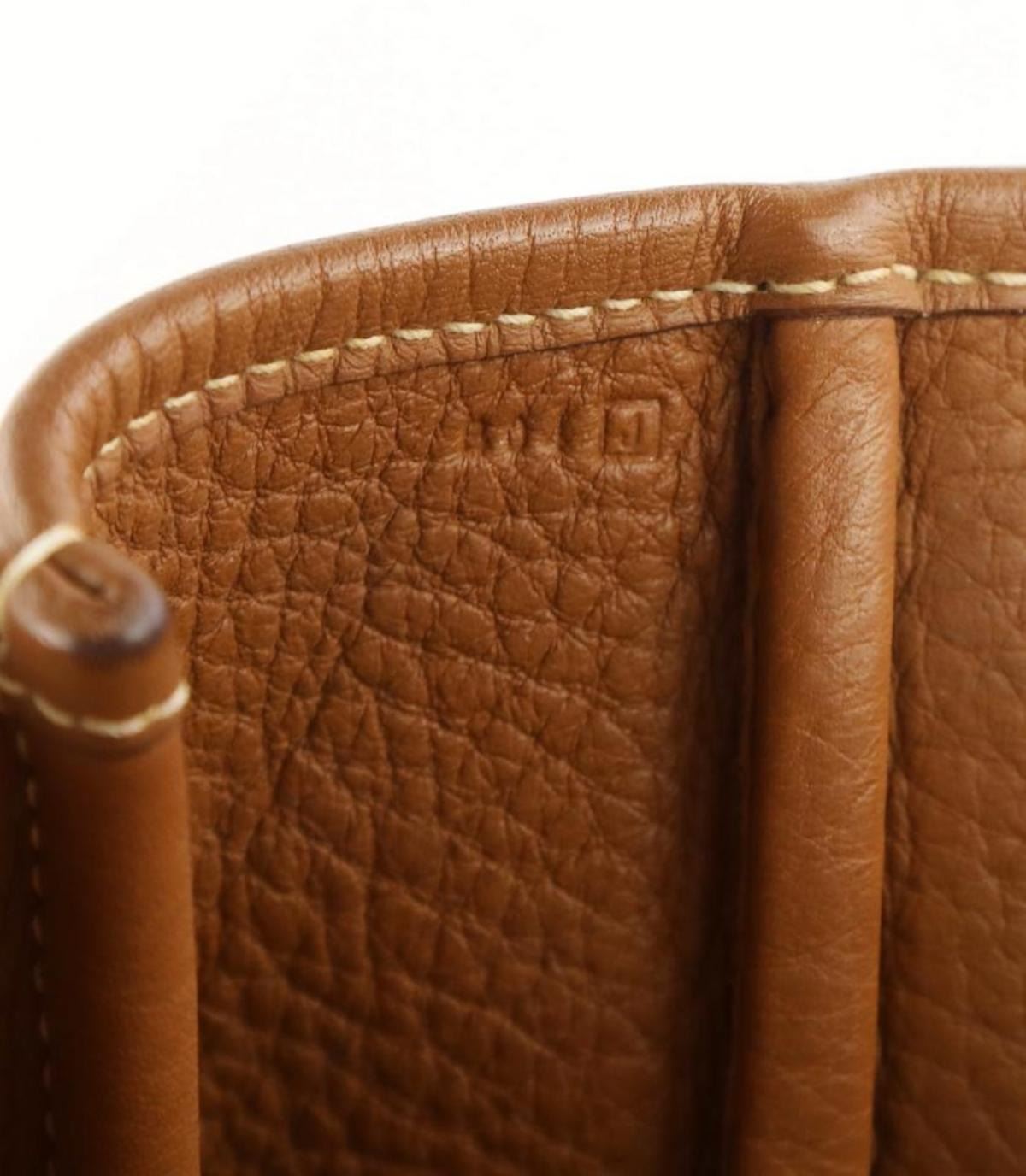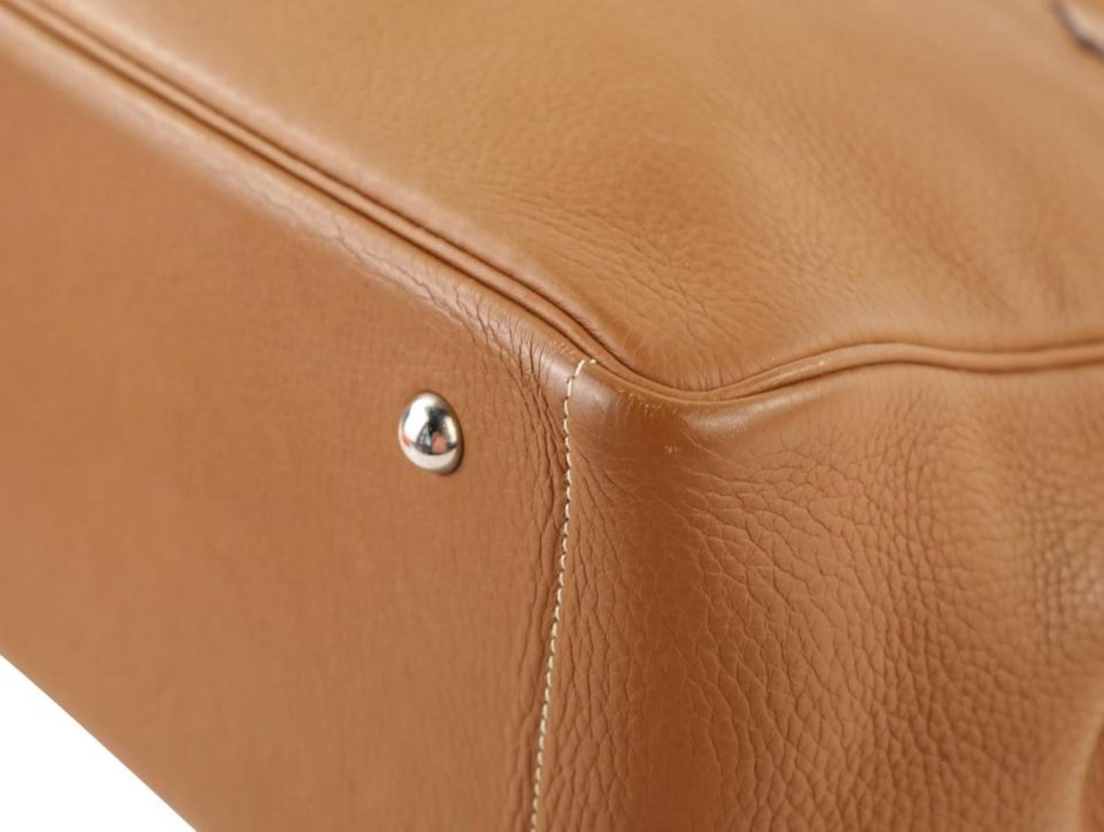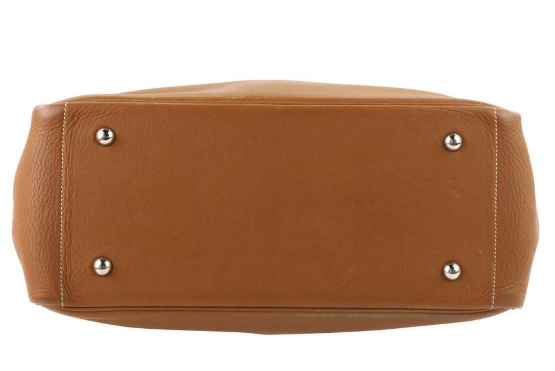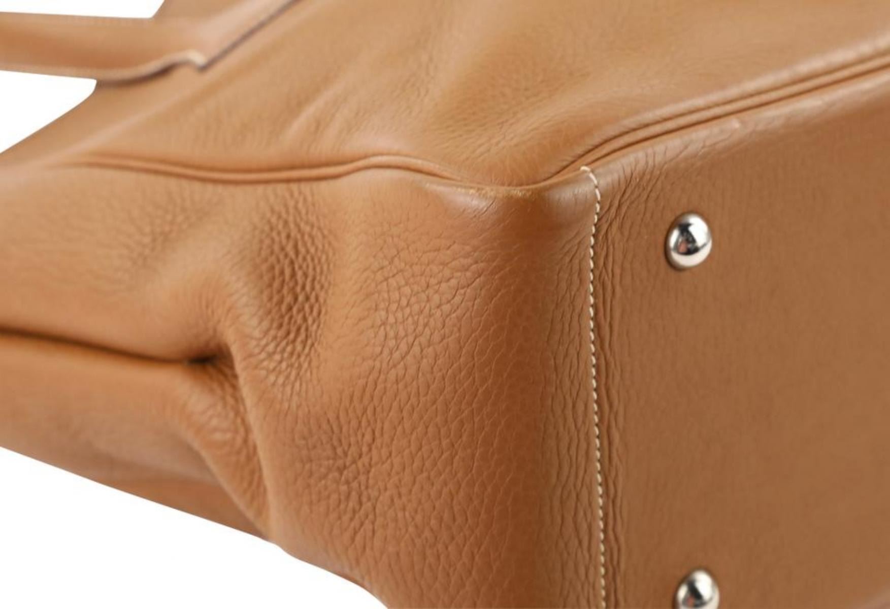 One Hermes Victoria Cabas Clemence 32 Brown Leather Shoulder Bag. Hermes Victoria Cabas Clemence Handle drop . " Can be worn over a single shoulder or carried at the elbow at the widest point ." Clemence is a matte grained leather Hermes color: Etrusque - which is very similar to the Hermes Gold (a light brown) color but is a few shades darker White tonal stitching Bag has a softly structured shape - cannot stand on its own Open top Palladium hardware with an interior zipper and protective feet at the base of the bag interior zip pocket Made in France