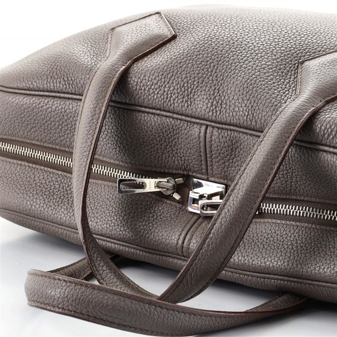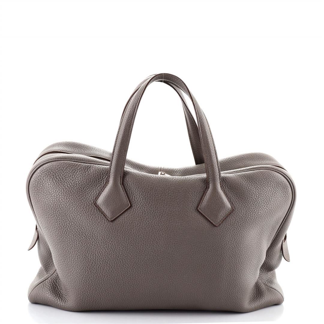 One Hermes Victoria II Travel Handbag Clemence 43. Item is sold AS-IS. All available information is listed in the description and shown in the photo. Hermes Victoria II Travel Handbag Clemence 43. Creasing on exterior, moderate wear on base corners, heavy cracking and splitting on handle wax edges. Wear and minor discoloration in interior, tarnish and scratches on hardware. 78848