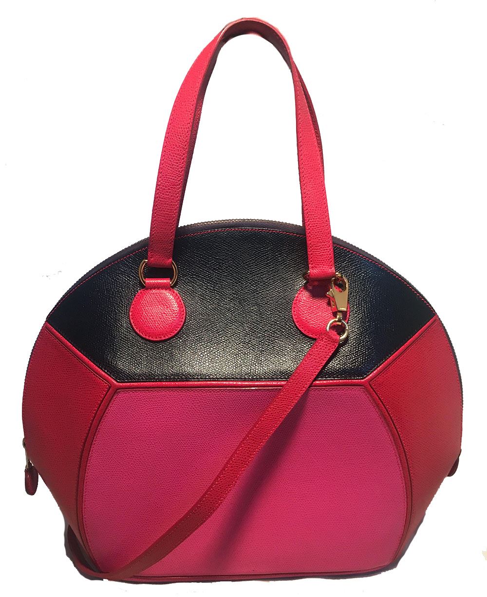 RARE Hermes Vintage Pink Red Black Color Block Epsom Round Ellipse Handbag in excellent condition. Red, pink, and black epsom leather exterior with gold hardware, double leather handles, and a removable red leather shoulder strap. Top zipper closure opens to a black soft and supple leather lined interior that holds 1 side slit pocket and plenty of space for all your essentials and more. Clean corners, and edges. Delicate scuffs on interior consistent with age and gentle use. Perfect for Hermes collectors and vintage lovers alike. Very rare design, a must-have for fashion lovers worldwide. Purchase includes a dust cover. Measurements: 15"x11.25"x3.5" 5.5" handle drop 17" strap drop   #Bags1241